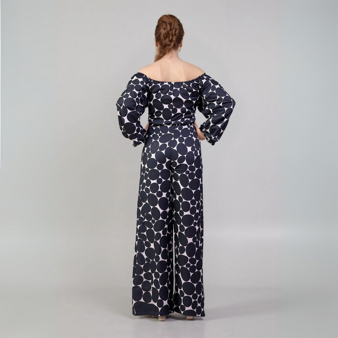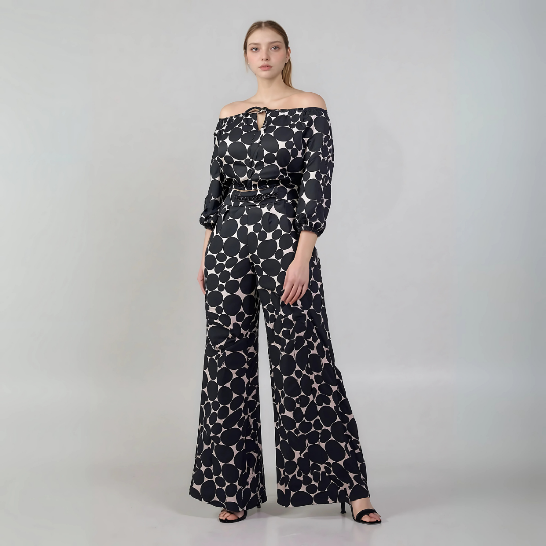 Introducing the Off-the-Shoulder Polka Dot Set, a chic and contemporary two-piece ensemble designed for effortless elegance. The top features a flattering off-the-shoulder neckline with a subtle cinched detail at the center, complemented by long sleeves gathered at the elbows for a touch of volume. The coordinating wide-leg trousers offer a relaxed yet sophisticated silhouette, flowing gracefully from the high waist. Both pieces are adorned with a bold and graphic black and off-white polka dot print, creating a striking visual statement. Crafted from a fluid fabric, this set is an ideal choice for elevated casual occasions, offering both style and comfortable wear.