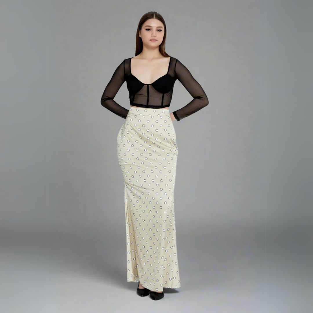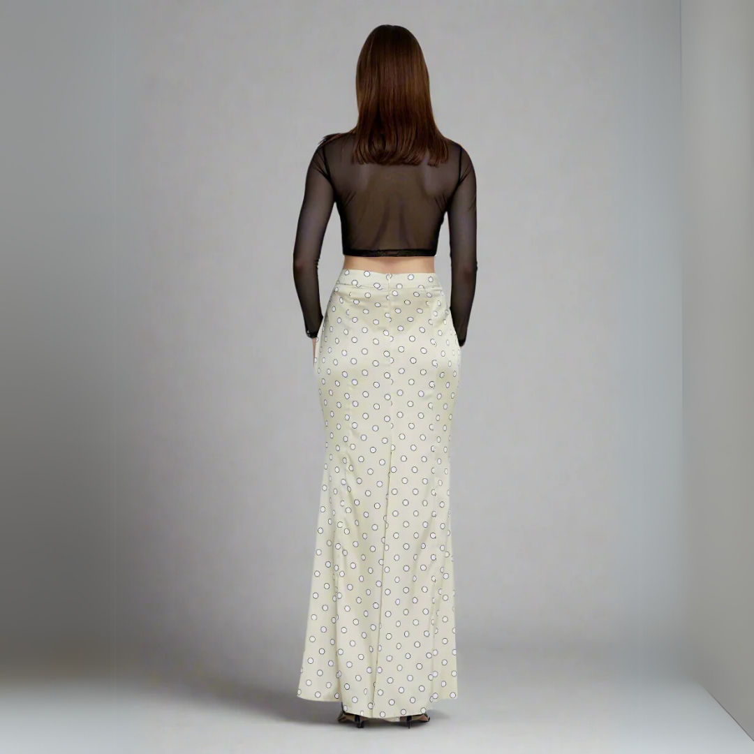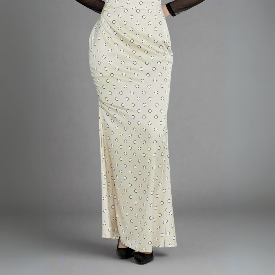 Introducing the Polka Dot Maxi Skirt, a classic and sophisticated piece designed to elevate your wardrobe with timeless charm. This full-length skirt is crafted from a luxurious, lustrous polyester fabric with a satin-like finish, presented in a delicate beige hue. It is adorned with a charming pattern of evenly spaced black outline polka dots, creating a refined and playful visual. The polyester fabric drapes elegantly, offering a sleek silhouette with subtle movement. This skirt is an ideal choice for both polished daytime ensembles and sophisticated evening occasions, offering versatile style with a touch of classic allure.