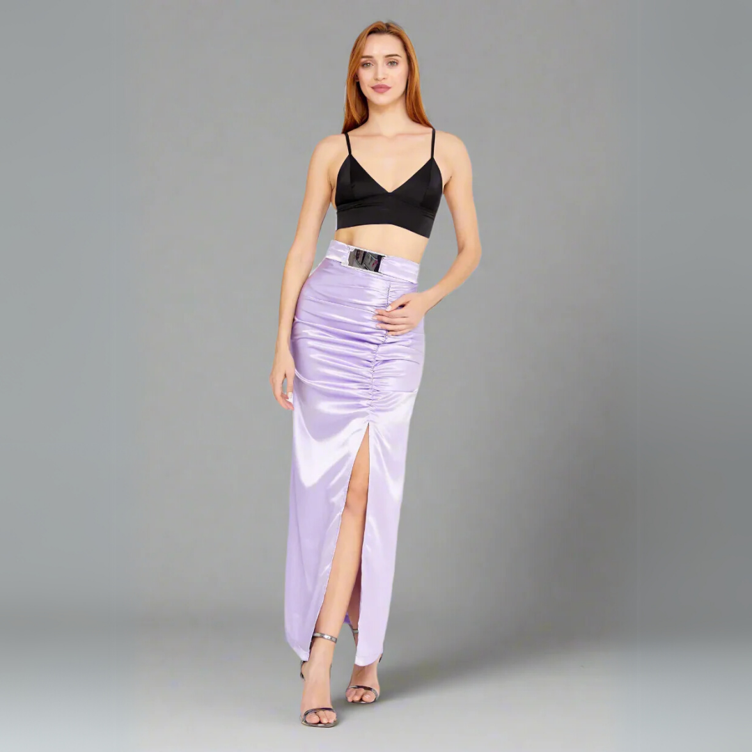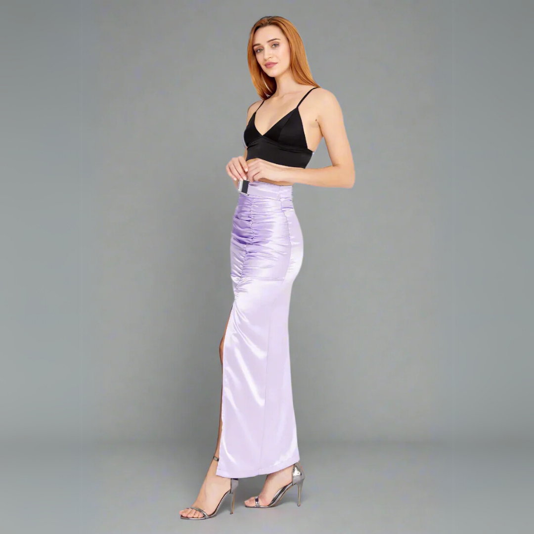 Introducing the Ruched High-Slit Satin-Effect Maxi Skirt, a captivating piece designed for both elegance and alluring movement. This skirt is crafted from a luxurious, lustrous polyester fabric that drapes beautifully to a maxi length, offering a rich satin-like appearance. It features artful ruching at the hip, creating a flattering texture and enhancing the silhouette. A sophisticated high-slit adds a touch of modern allure, ensuring graceful flow with every step. Available in a delicate Saffron Yellow and an enchanting Lavender, this skirt is an ideal choice for elevated evening wear, special occasions, or a refined statement.