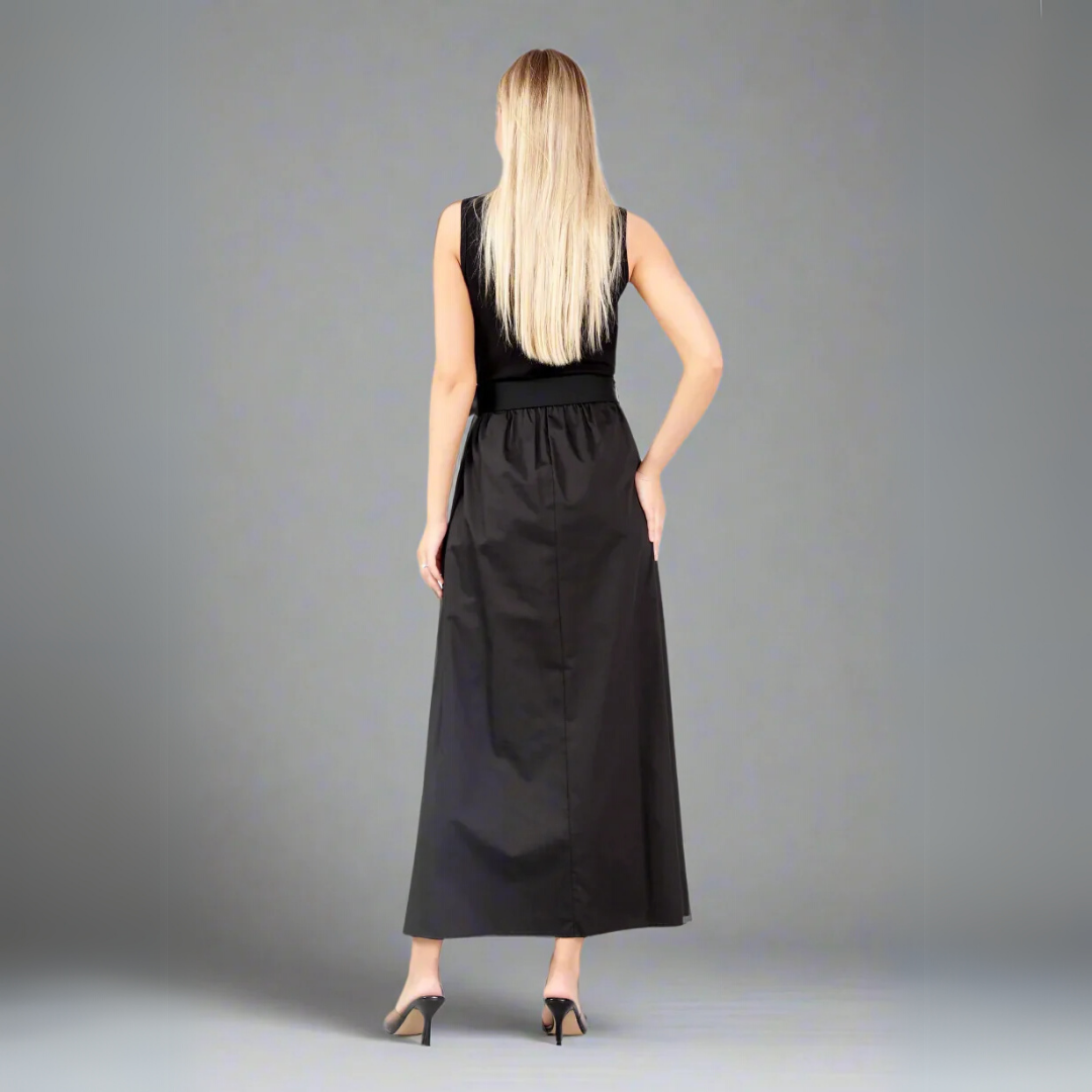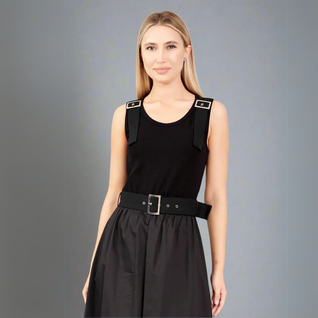 Introducing the Modern Belted Maxi Dress with Shoulder Details, a chic and versatile piece designed for effortless contemporary style. This full-length maxi dress features a flattering sleeveless silhouette with a classic scoop neckline. Unique strap details with subtle buckle accents adorn the shoulders, adding a distinctive touch. A coordinating wide belt with a rectangular buckle cinches the waist, creating a defined and elegant shape. The skirt cascades with a graceful A-line drape and includes a discreet side slit, ensuring comfortable movement. Crafted from a blend of Polyester and viscose, this dress offers both comfort and a smooth, flattering fit. It is available in baby Pink, classic White, and sophisticated Black, making it an ideal choice for elevated casual wear, daytime events, or refined resort styling.