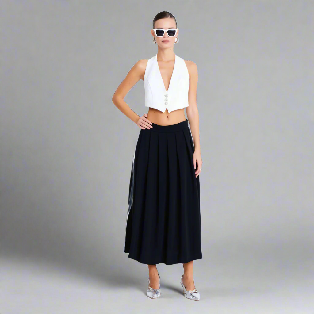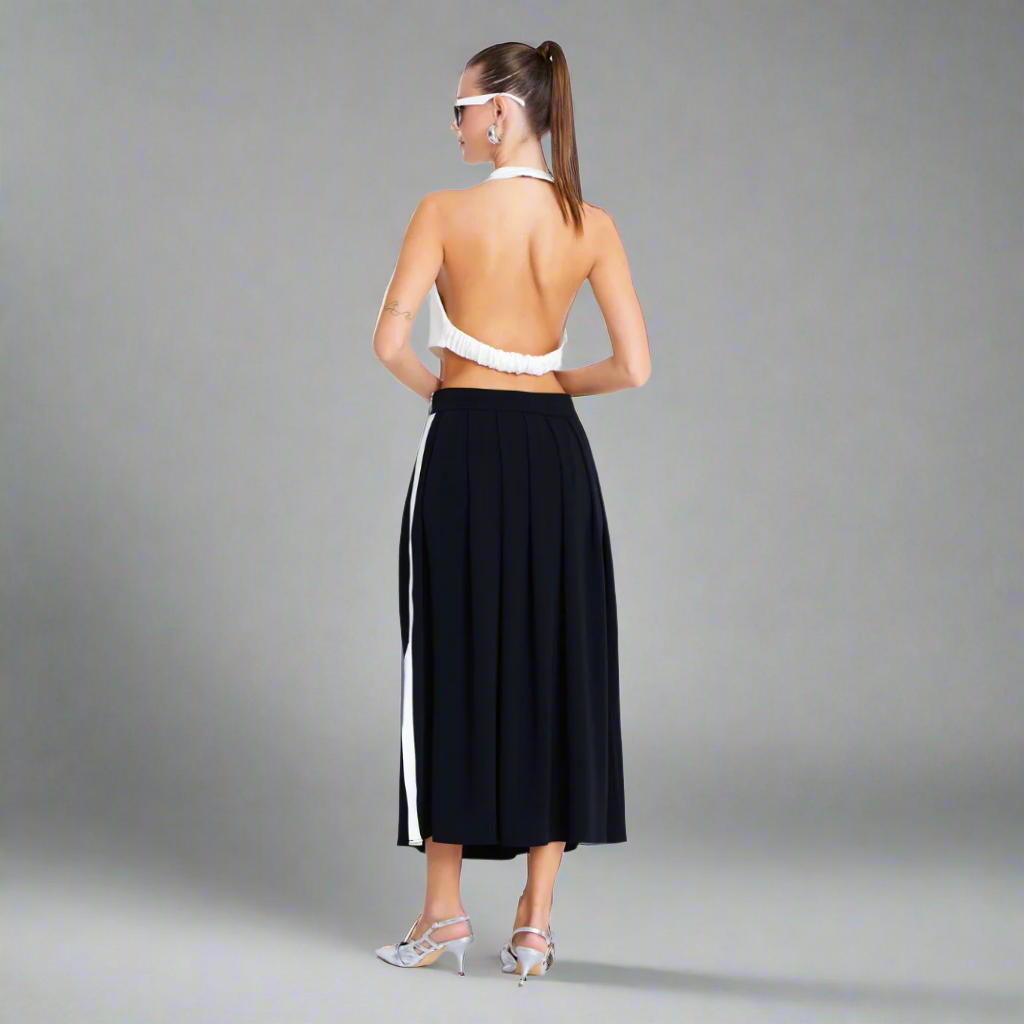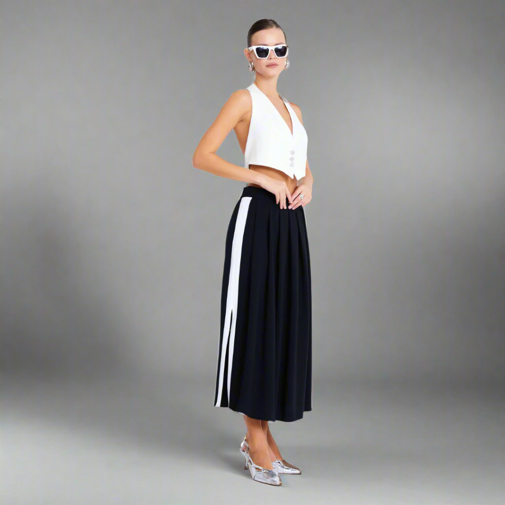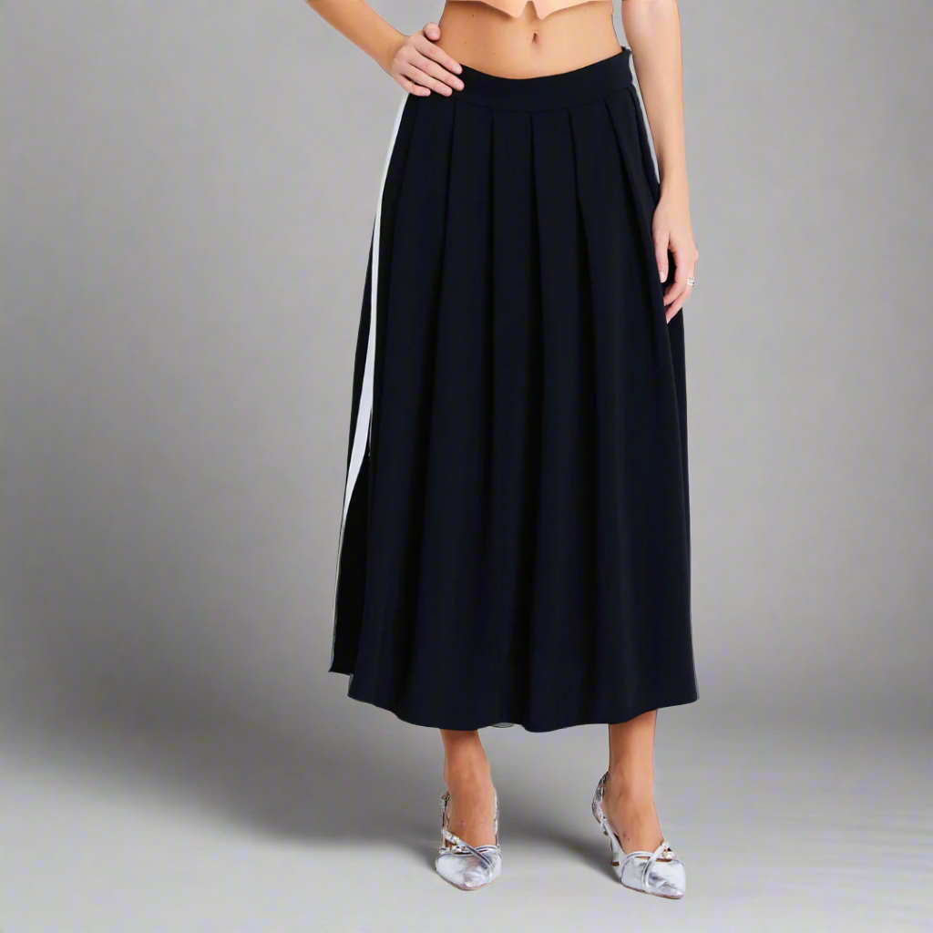 Introducing the Pleated Midi Skirt with Contrast Side Stripe, a dynamic and sophisticated piece designed to blend classic elegance with athletic-inspired detailing. This midi-length skirt is rendered in a deep black hue and features crisp, uniform pleats that create graceful movement and a flattering silhouette. A striking white stripe runs vertically down, offering a modern, sporty contrast to the refined pleating. This skirt is an ideal choice for creating contemporary chic ensembles, suitable for both elevated casual wear and smart-casual occasions, offering a versatile blend of style and comfort.