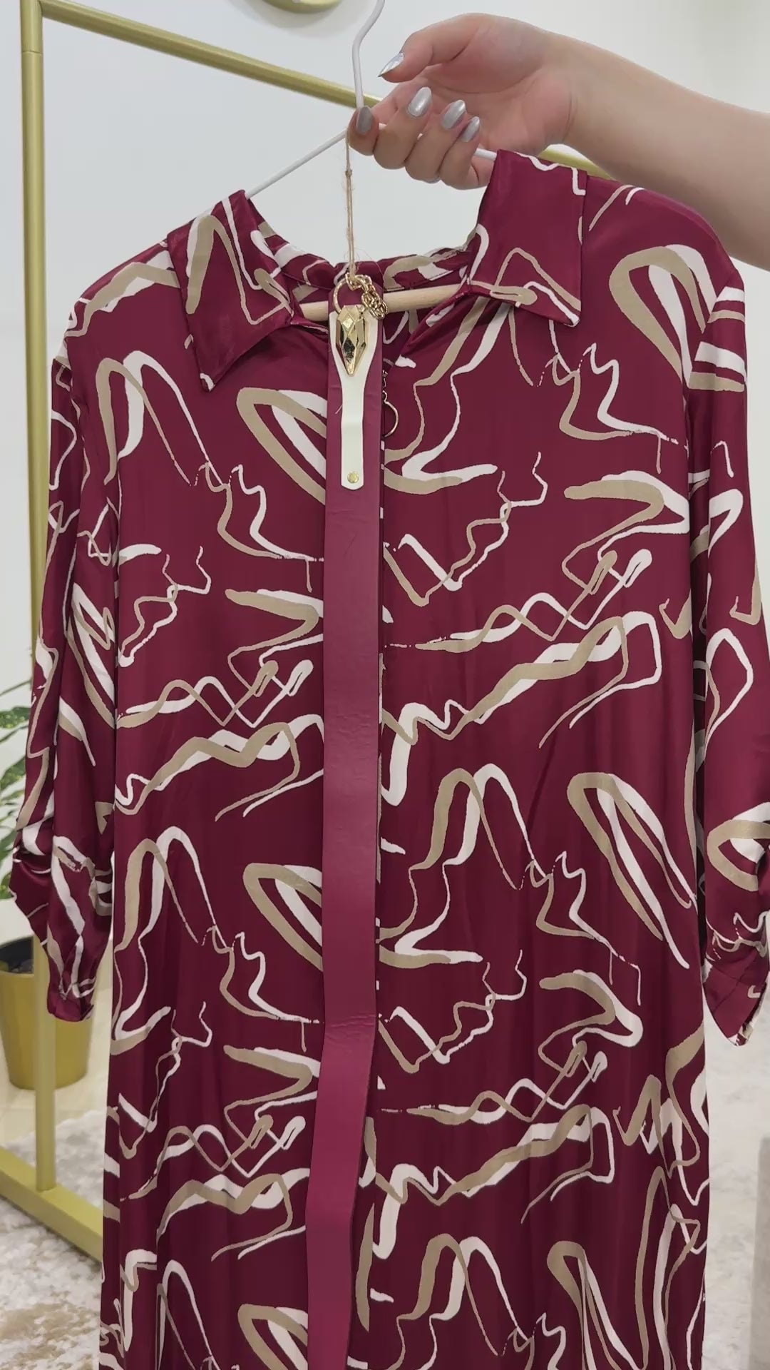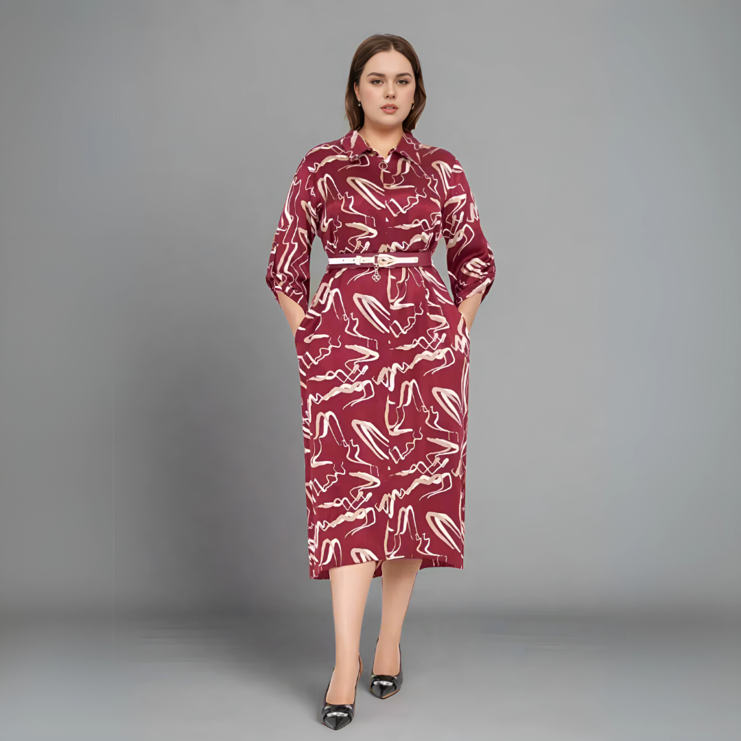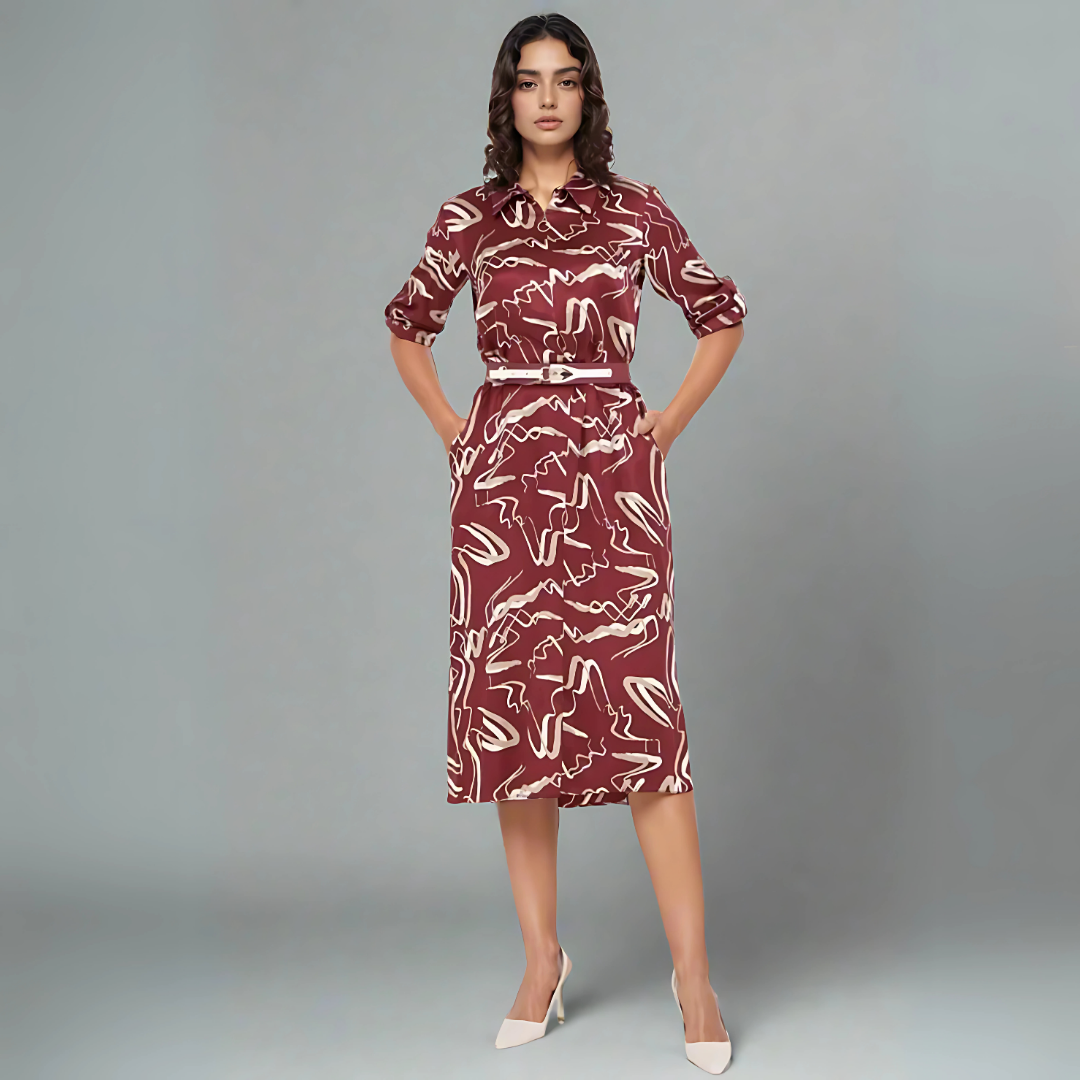 This expertly crafted patterned red midi dress is a sophisticated and artistic piece designed for modern elegance. This midi-length dress is crafted in a rich, deep red or burgundy hue, adorned with an intriguing abstract white print that offers a unique visual appeal. It features a classic shirt collar and a concealed button-front placket, maintaining a sleek silhouette. The sleeves are a comfortable three-quarter length with elasticated cuffs, adding a subtle blouson effect. A contrasting crisp white belt with a rectangular buckle cinches the waist, defining the figure and providing a fresh accent. This dress is an ideal choice for a chic daytime look, a creative professional setting, or an elevated casual ensemble.