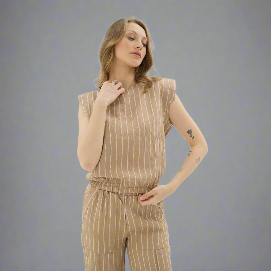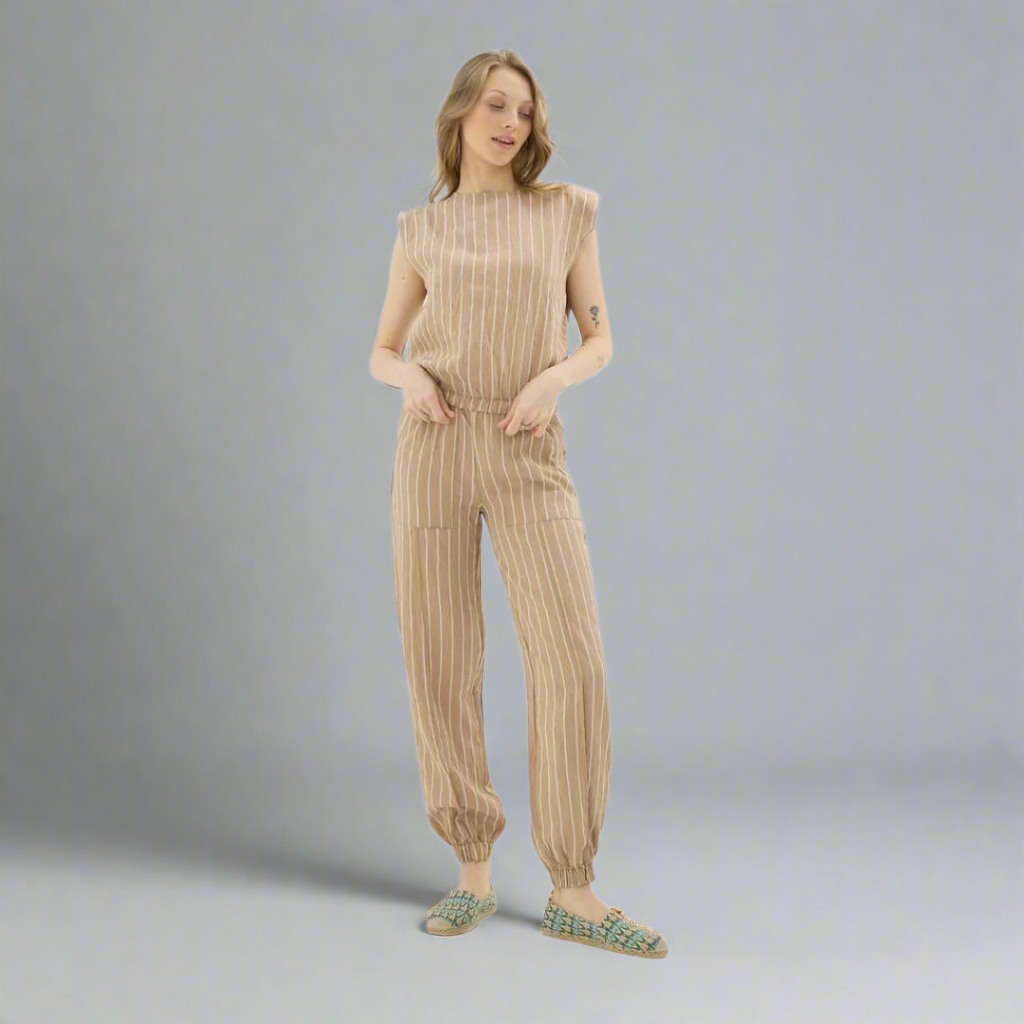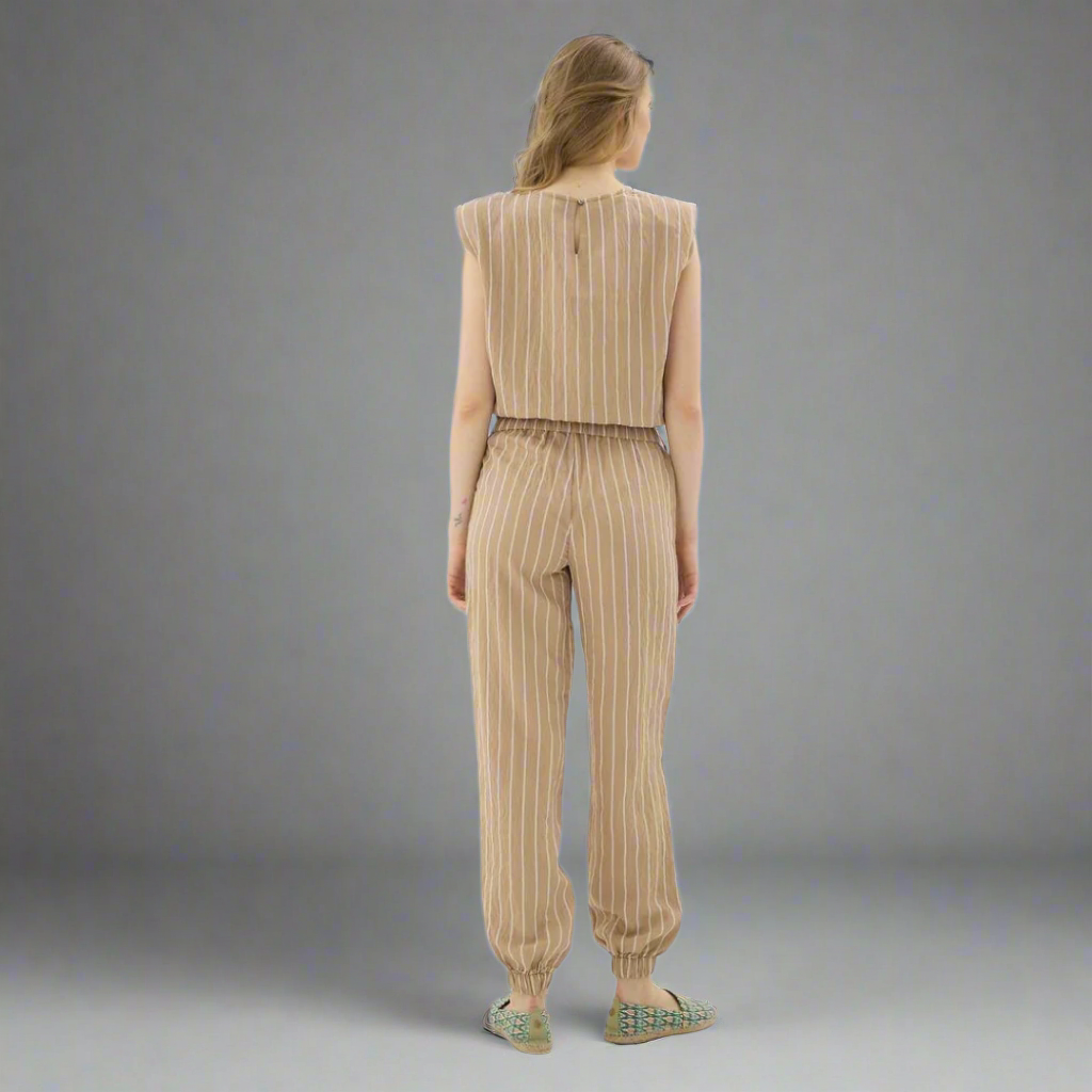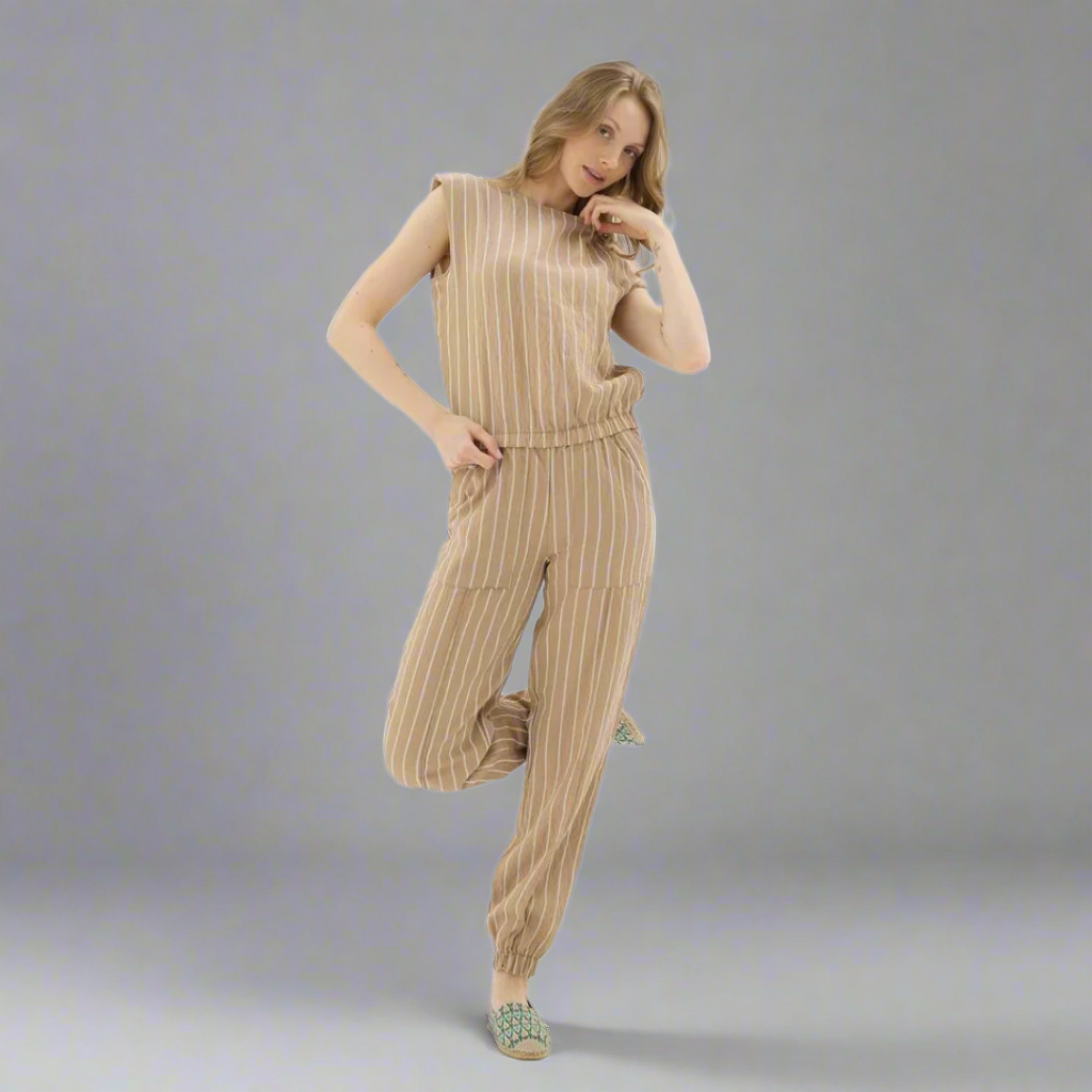 Introducing the Pinstripe Structured Trousers, a standalone piece designed for sophisticated comfort. These trousers feature a refined beige base adorned with subtle vertical pinstripes, offering a sleek and elongating effect. Crafted with a relaxed fit and an elasticated waistband, they provide exceptional ease of movement and a flattering drape. The tapered leg culminates in a comfortable jogger cuff, making them ideal for both relaxed wear and elevated casual styling.