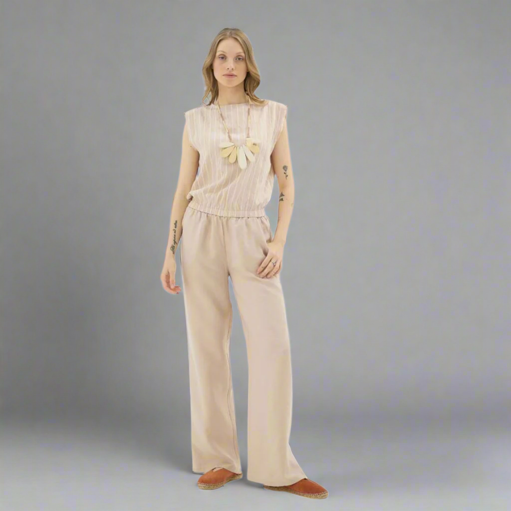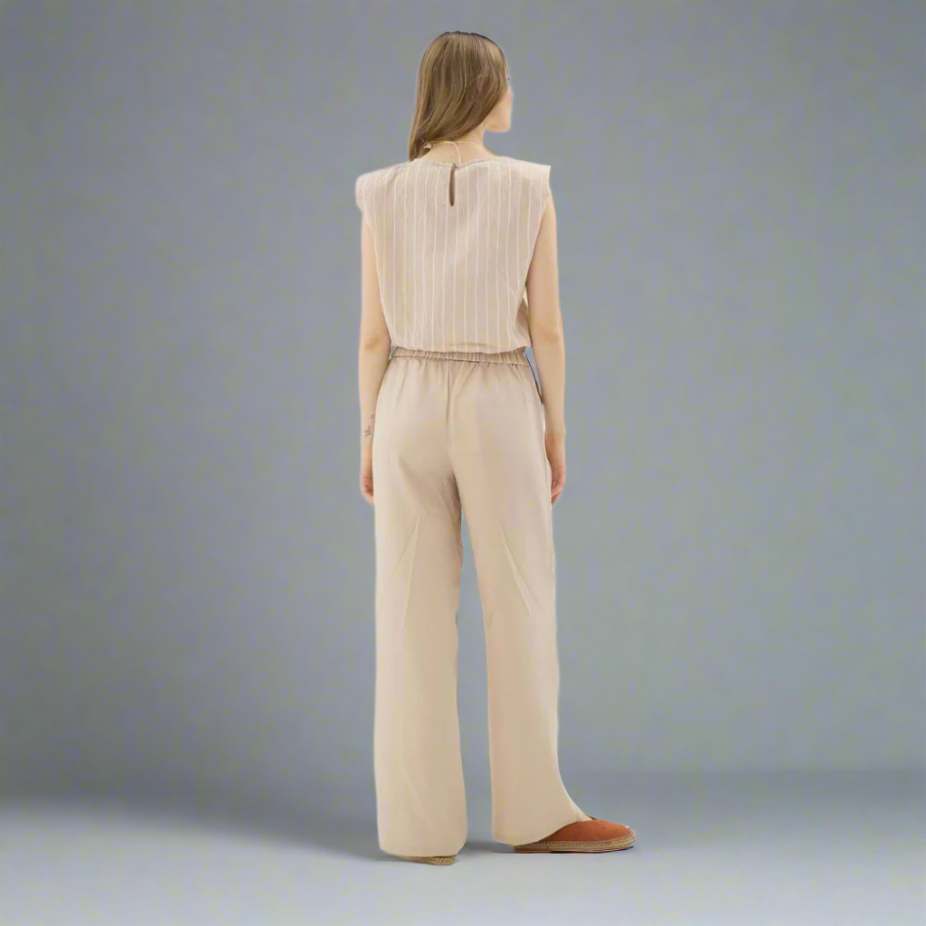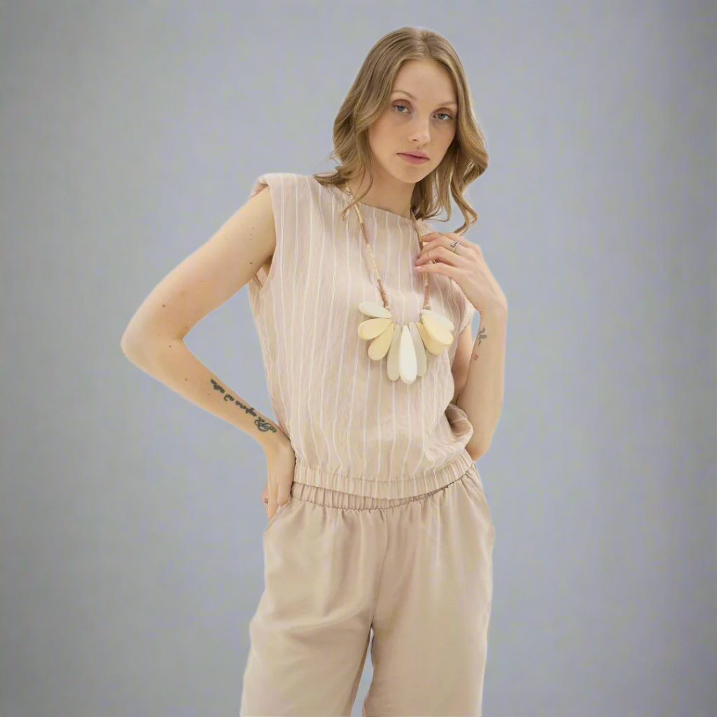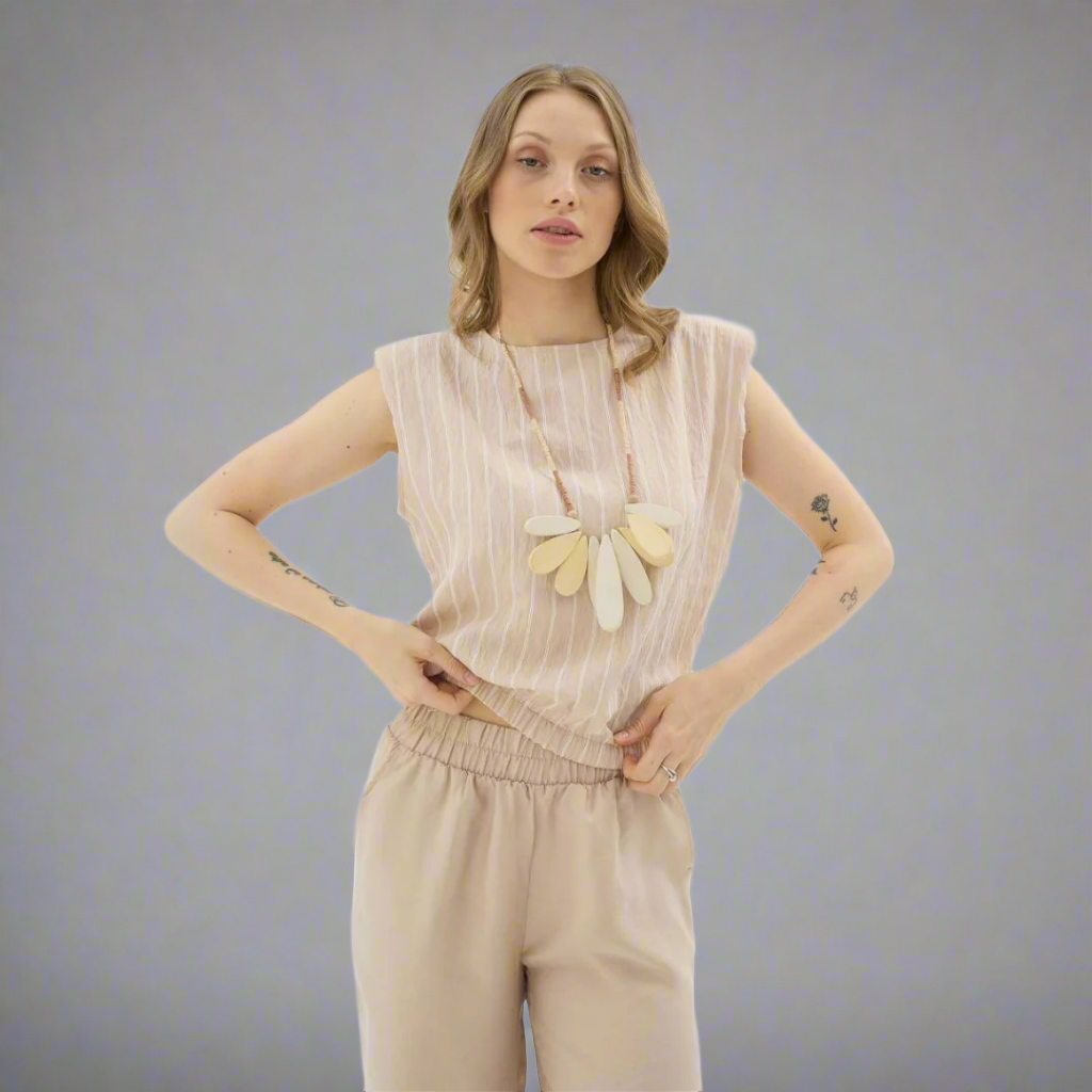 Elevate your casual chic with our Structured Pinstripe Sleeveless Top, available in a sophisticated palette of Fuchsia, Beige,Light Brown and Dark Brown. Each iteration features crisp white vertical pinstripes, offering a dynamic visual appeal against the rich base tones. The design is distinguished by its pronounced, structured shoulder pads, lending a modern, architectural silhouette that broadens the frame and adds an element of refined strength. Crafted for breathability and comfort, the top is designed with a relaxed fit through the body, ensuring effortless wearability. This versatile garment seamlessly transitions from daytime casual to an evening statement, making it an essential addition to a discerning wardrobe.