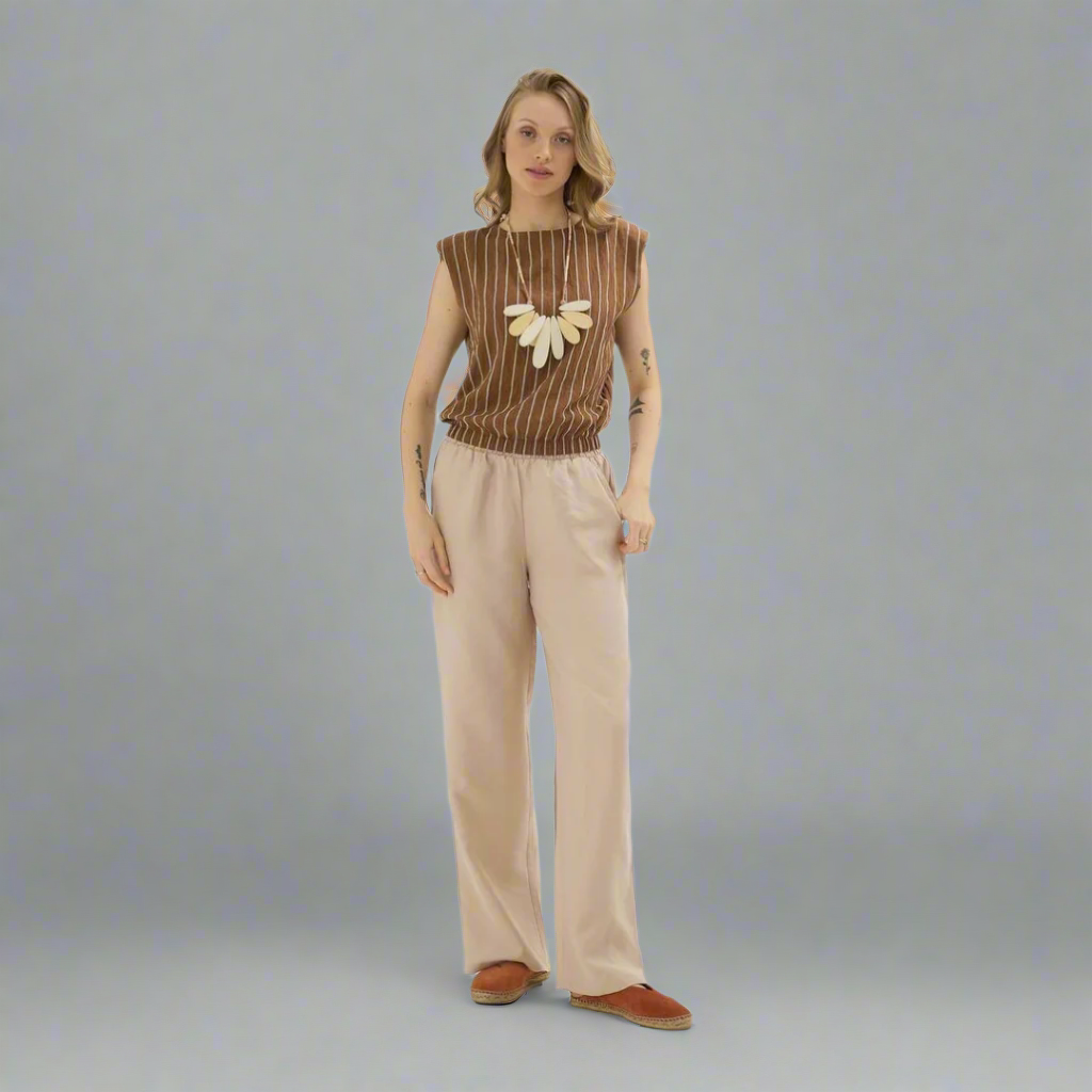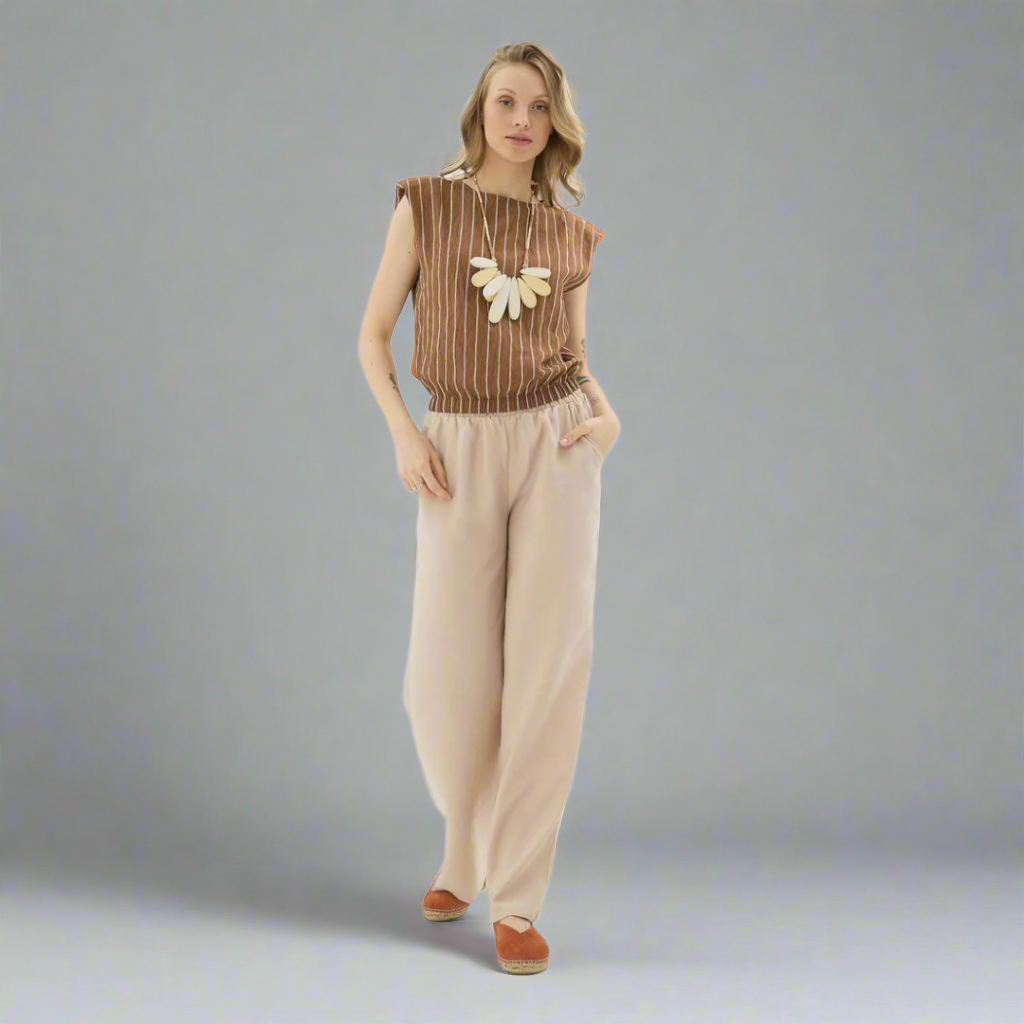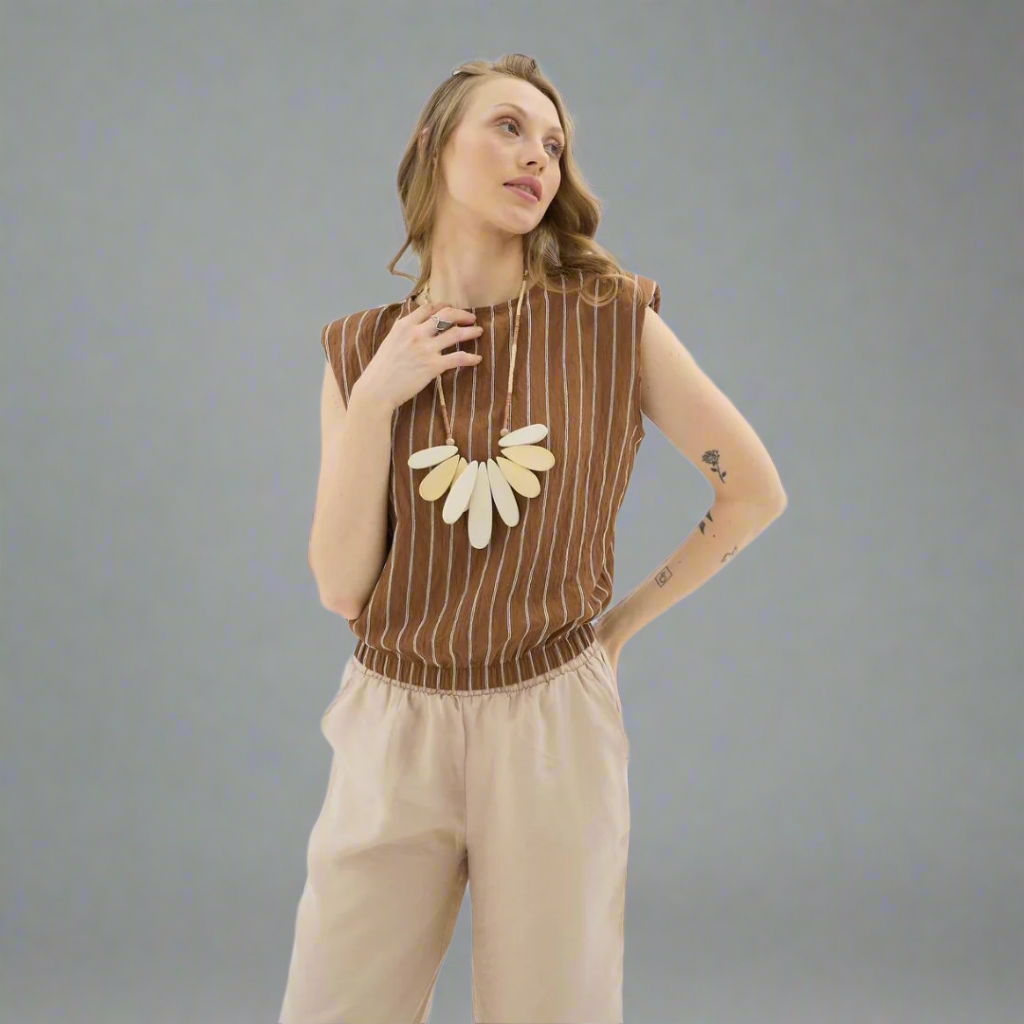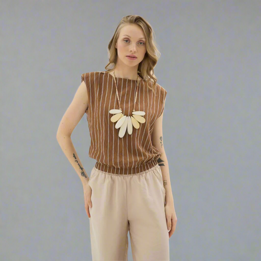 Elevate your casual chic with our Structured Pinstripe Sleeveless Top, available in a sophisticated palette of Fuchsia, Beige,Light Brown and Dark Brown. Each iteration features crisp white vertical pinstripes, offering a dynamic visual appeal against the rich base tones. The design is distinguished by its pronounced, structured shoulder pads, lending a modern, architectural silhouette that broadens the frame and adds an element of refined strength. Crafted for breathability and comfort, the top is designed with a relaxed fit through the body, ensuring effortless wearability. This versatile garment seamlessly transitions from daytime casual to an evening statement, making it an essential addition to a discerning wardrobe.