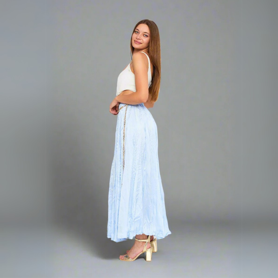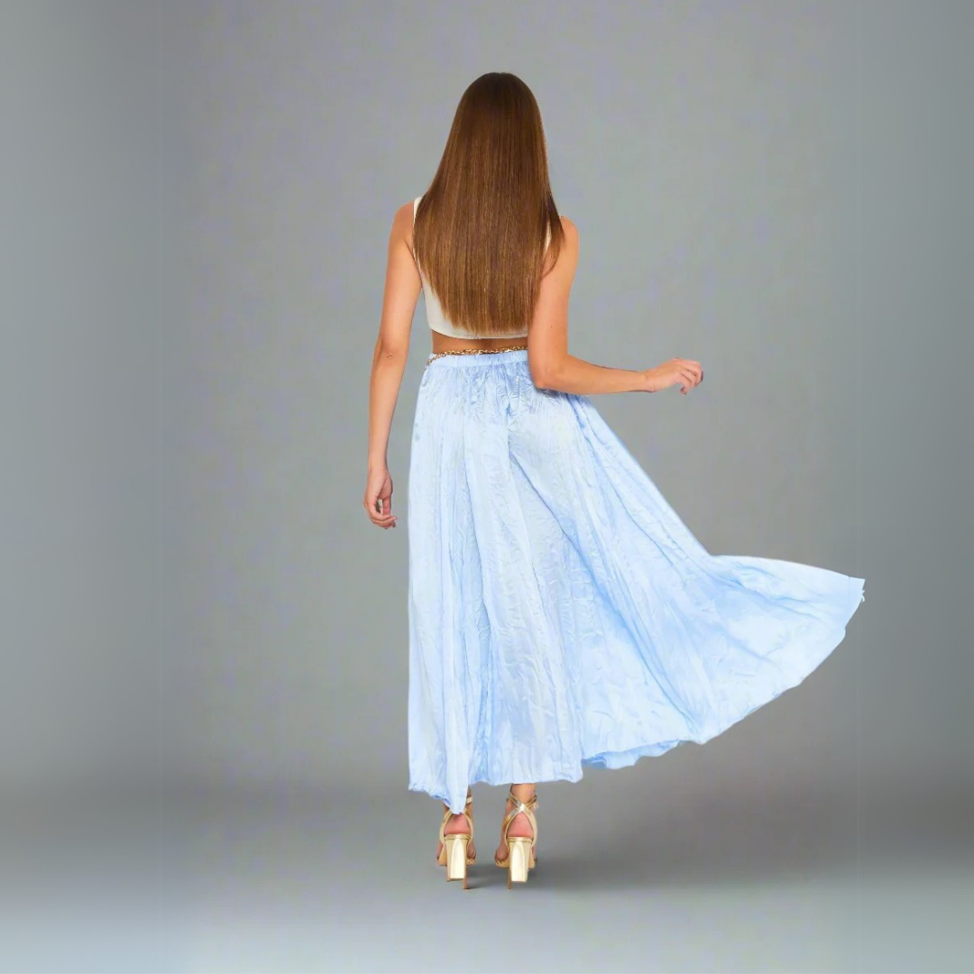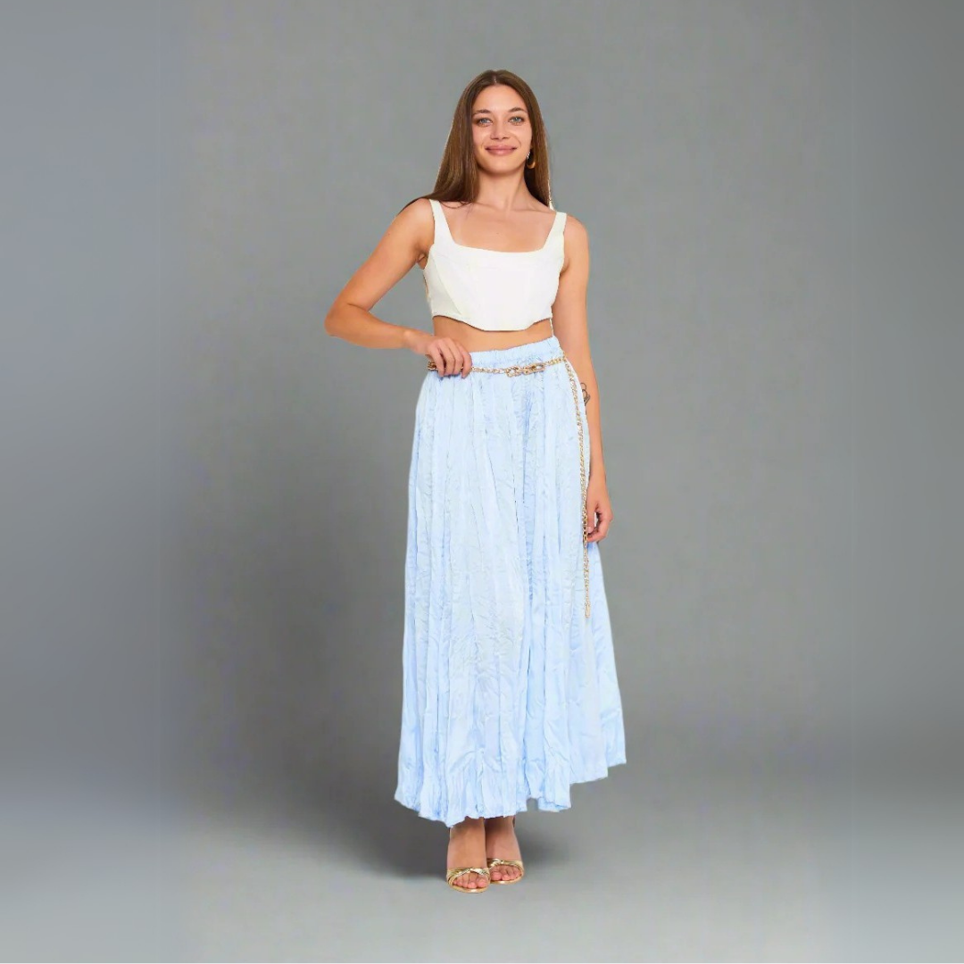 Discover the allure of effortless movement with our Sky Blue Maxi Skirt. Rendered in a delicate light blue, this skirt features an artfully crinkled texture that imparts a distinctive visual and tactile quality. Its voluminous, flowing silhouette ensures a graceful drape and comfortable wear, embodying a relaxed sophistication. Designed to transcend seasonal trends, this versatile maxi skirt serves as an elegant cornerstone for a variety of ensembles, from casual daytime aesthetics to more elevated evening looks, offering both comfort and an understated luxury.