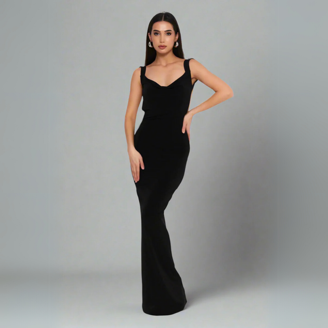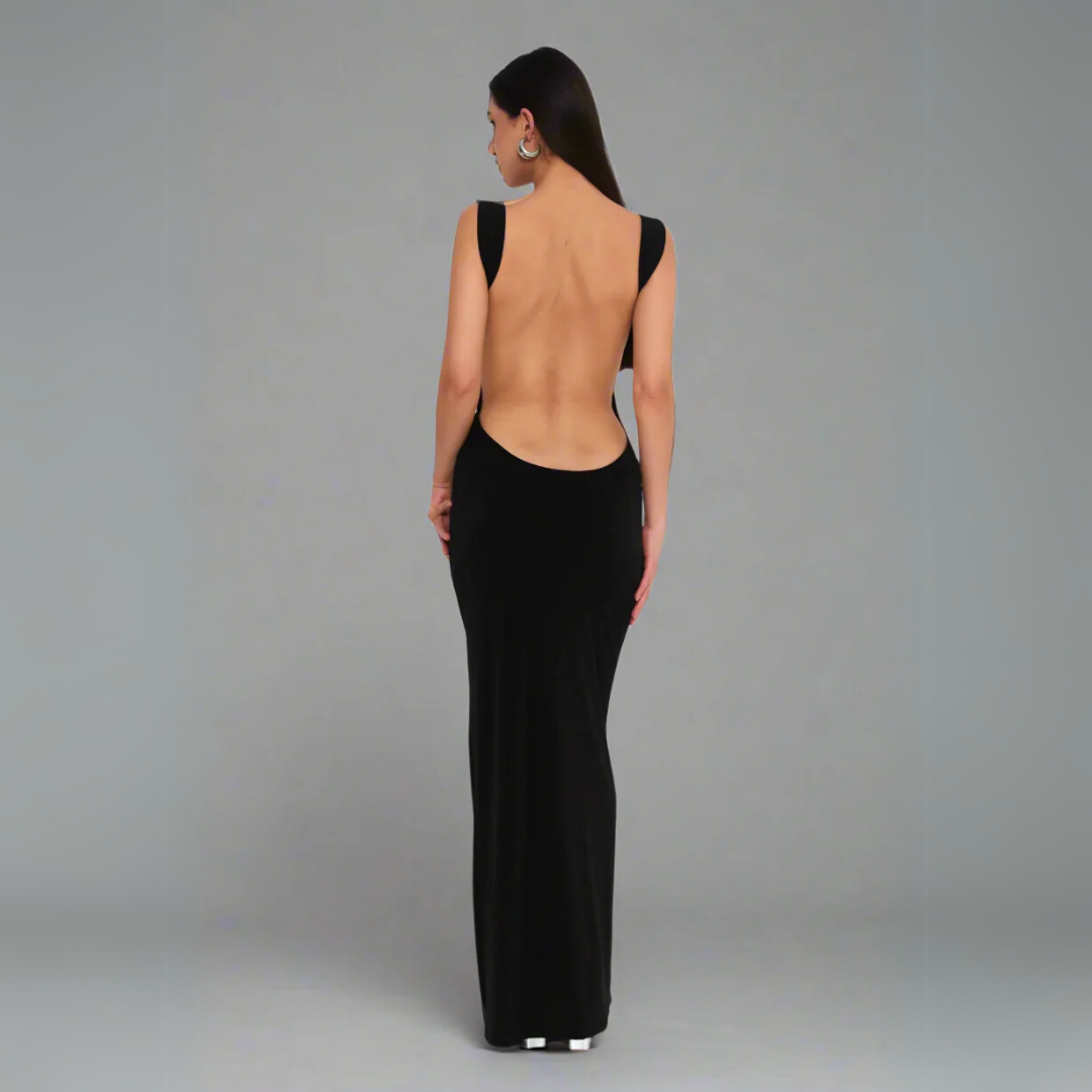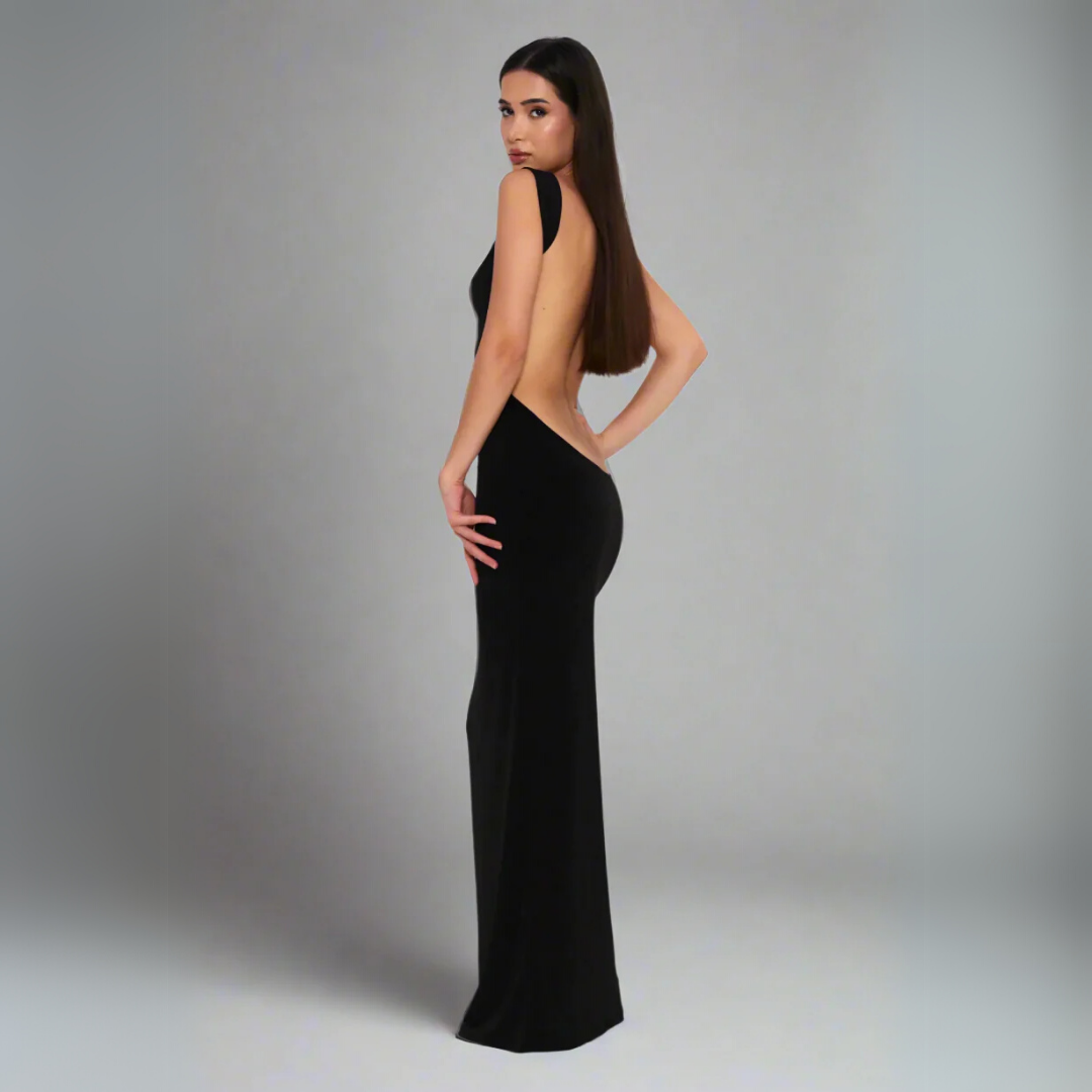 Introducing the Sculptural Open-Back Maxi Dress, a breathtaking piece designed to create an unforgettable impression. This elegant maxi-length gown features a sleek, form-fitting silhouette that gracefully accentuates the figure before subtly flaring out towards the hem. The front showcases a refined neckline, complemented by broad, supportive shoulder straps. The true focal point is the dramatically low, scooped open back, designed to leave a striking impression. Crafted from a luxurious blend of Polyester and Elastane, this gown offers exceptional drape, comfort, and a flattering stretch. It is available in classic Black and a rich Brown hue, making it an impeccable choice for galas, or any occasion demanding sophisticated allure.