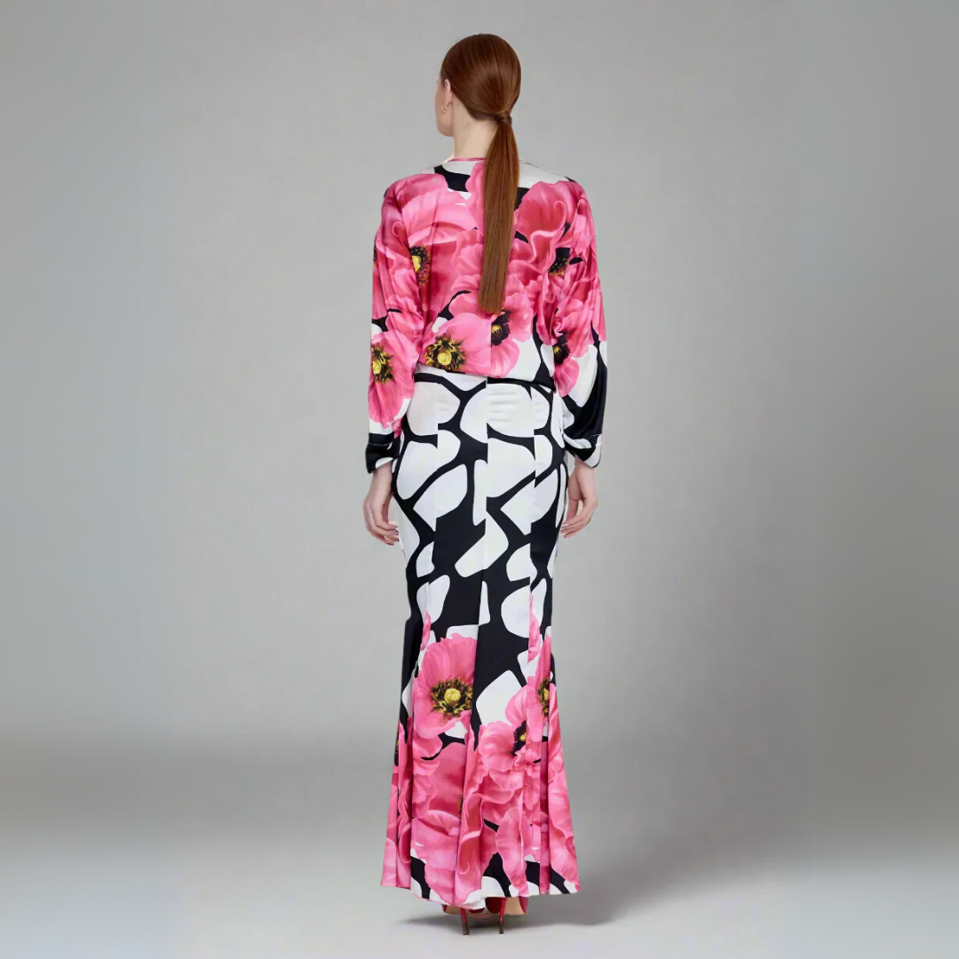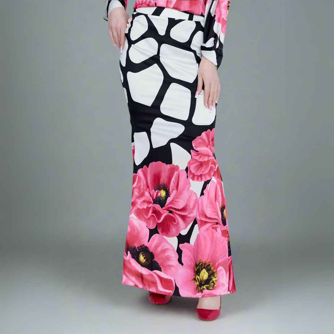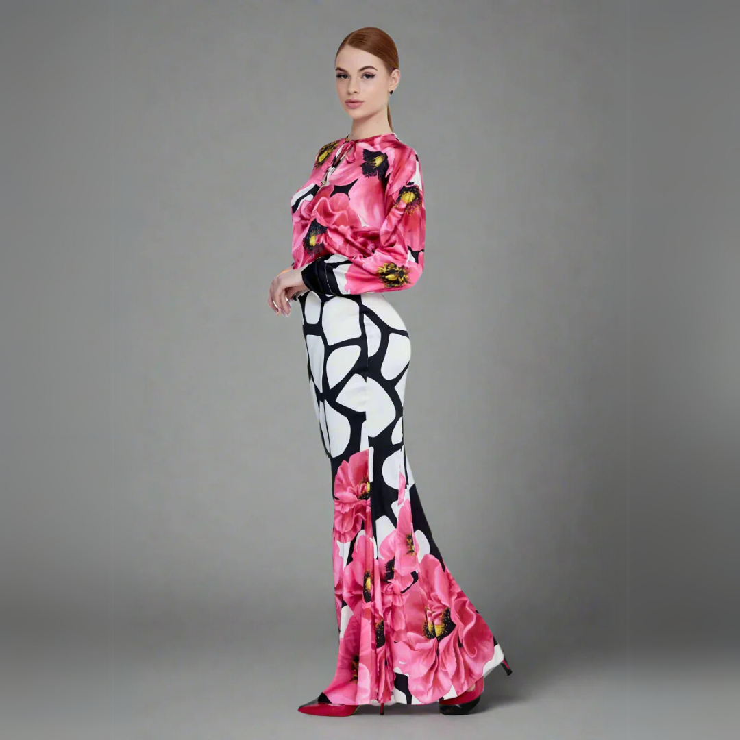 Introducing the Artistic Floral & Abstract Print Maxi Skirt, a captivating and bold piece designed to make a vibrant fashion statement. This full-length skirt features a sleek, figure-flattering silhouette with an innovative dual-pattern design. The upper section showcases a modern abstract pattern of black and white organic shapes, creating a striking contrast. This transitions seamlessly into a lower section adorned with large, vivid fuchsia and pink floral blooms with dark centers, infusing the design with romantic flair. Crafted from a fluid fabric, this skirt is an ideal choice for elevated evening events, artistic gatherings, or any occasion where a distinctive and memorable look is desired.