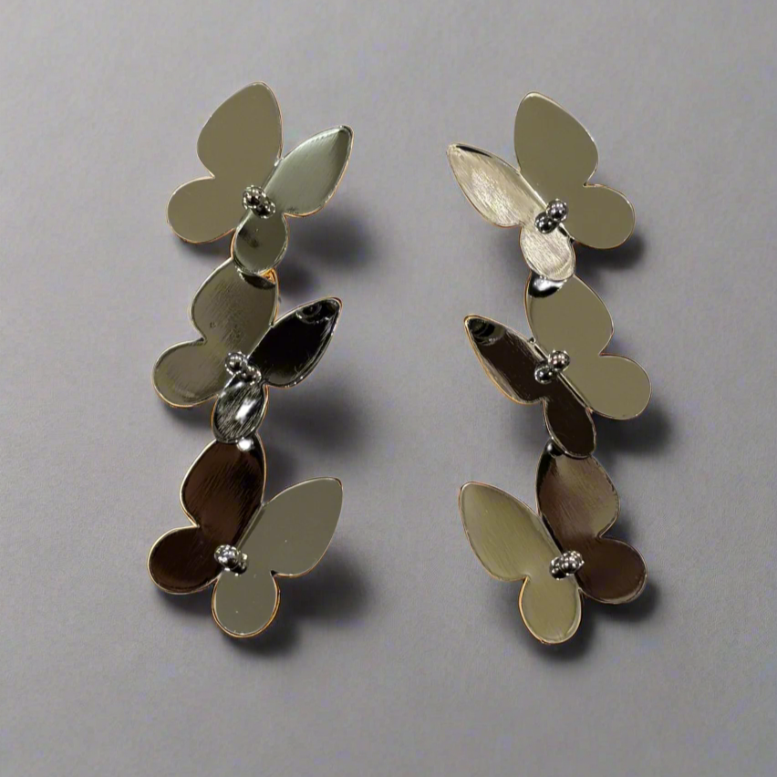 Introducing the Cascading Butterfly Drop Earrings, an enchanting pair designed to add dynamic movement and subtle shimmer to your look. These exquisite earrings feature a series of interconnected butterfly motifs, each crafted with a polished finish and adorned with a delicate central sparkle. Available in both radiant Gold-tone and sleek Silver-tone, these earrings create a graceful, elongated silhouette, making them a sophisticated choice for any occasion.
