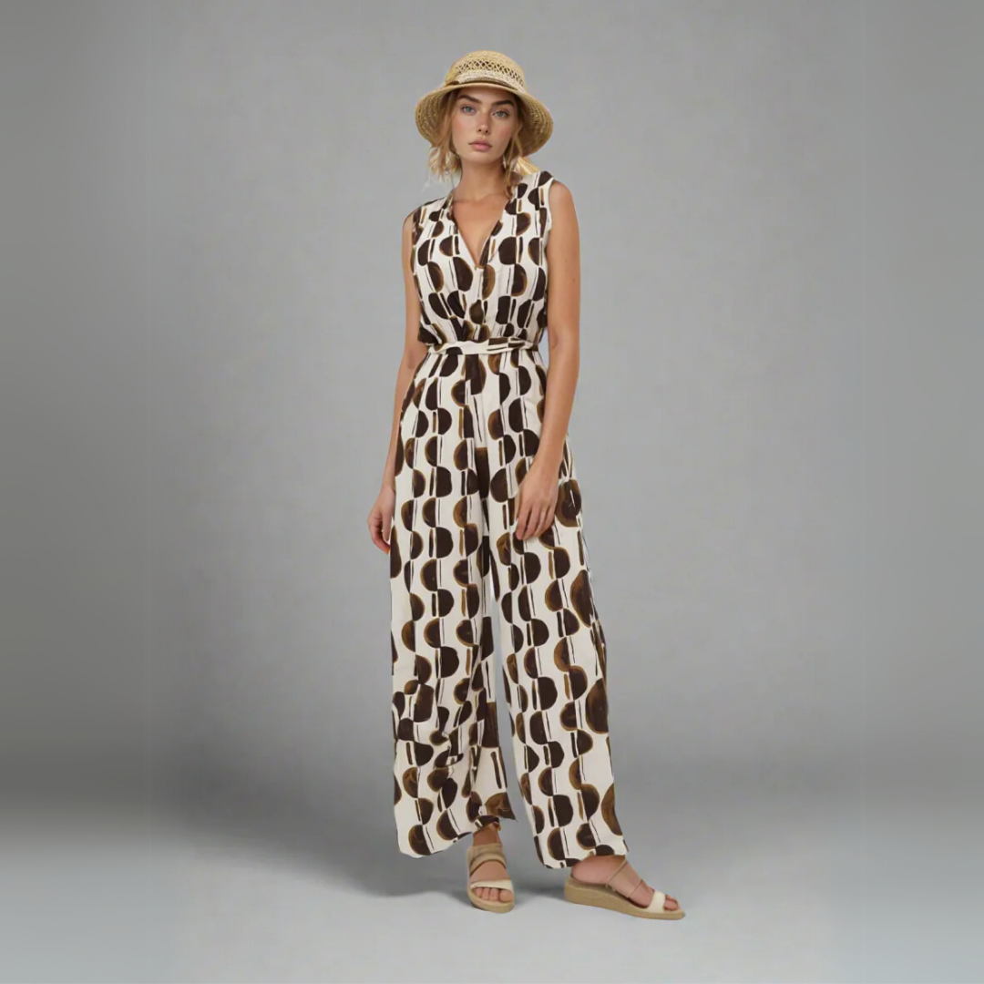 Introducing the Geometric Print V-Neck Jumpsuit, a chic and contemporary one-piece designed for sophisticated comfort. This jumpsuit features a flattering V-neckline and sleeveless design, offering a clean and modern silhouette. It is adorned with a captivating abstract geometric print in a harmonious palette of brown and off-white, creating a dynamic visual statement. A self-tie belt at the waist allows for adjustable cinching, creating a defined and elegant figure.