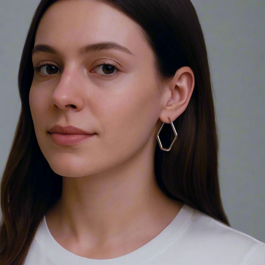 Introducing the Geometric Hexagonal Hoop Earrings, a contemporary and sophisticated accessory designed to elevate any look. These unique hoops feature a distinctive hexagonal silhouette, offering a modern twist on the classic hoop design. Crafted with a sleek, polished finish, they are available in both radiant Gold-tone and refined Silver-tone, providing versatile options to complement diverse styles. These earrings are ideal for those who appreciate minimalist design with a geometric edge, adding a subtle yet impactful statement to both casual and elevated ensembles.