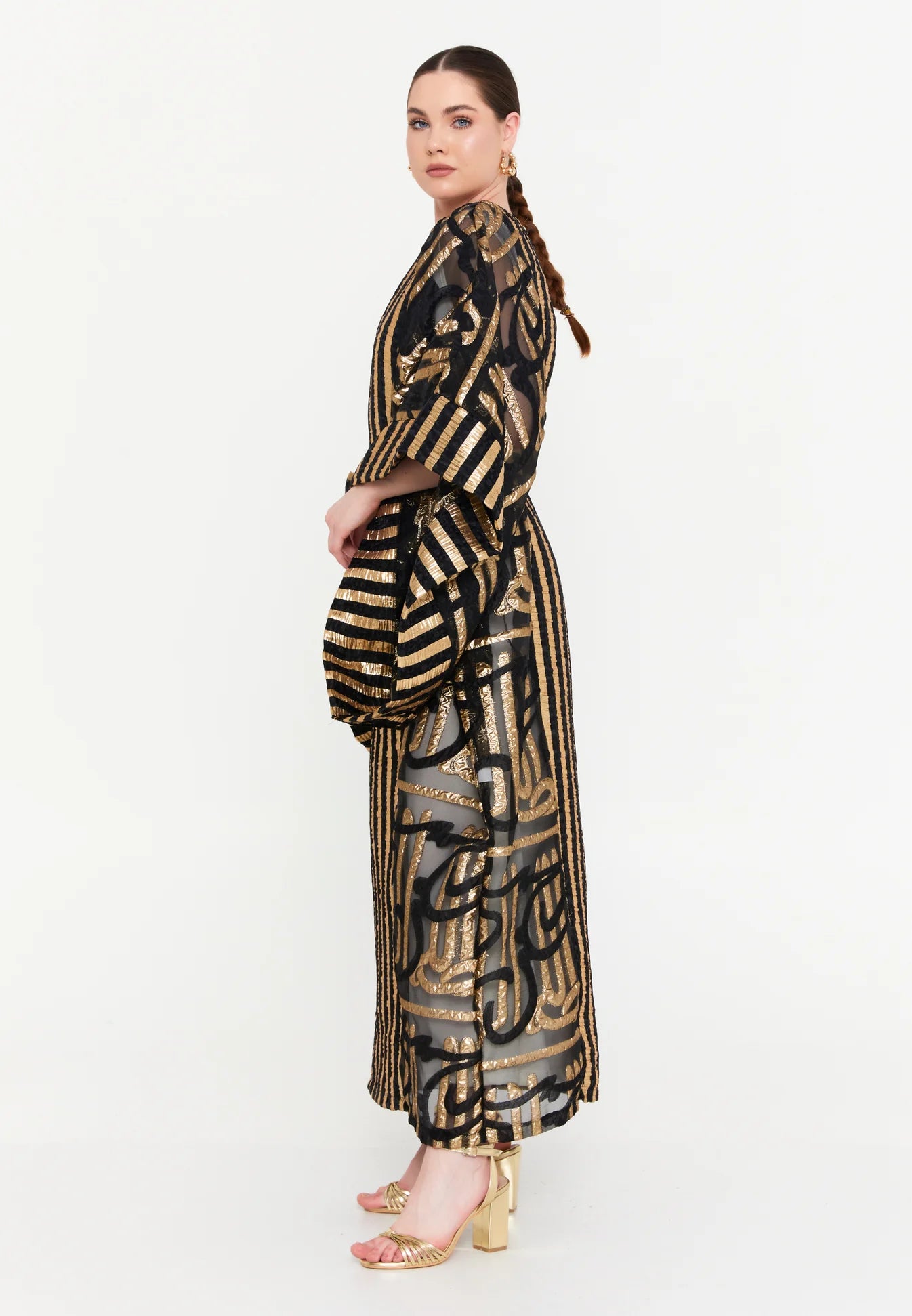 Introducing the Glimmering Striped & Textured Polyester Abaya, a truly magnificent piece designed for opulent elegance and a dramatic presence. This regular-fit abaya is crafted from Polyester, featuring a striking combination of sheer and opaque textures. It boasts bold vertical stripes in shimmering gold, intricately woven or embellished, contrasting beautifully with sections of abstract black textured patterns over a sheer base. The design is characterized by exceptionally wide, voluminous "batwing" sleeves that create a grand, flowing silhouette. A matching self-tie belt cinches the waist, allowing for adjustable definition while maintaining its luxurious drape. This abaya is an exquisite choice for grand celebrations, high-profile events, or for anyone seeking to make a resplendent and unforgettable fashion statement with its luxurious interplay of gold and black.