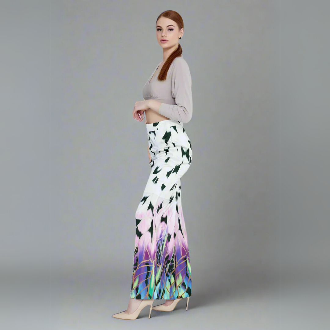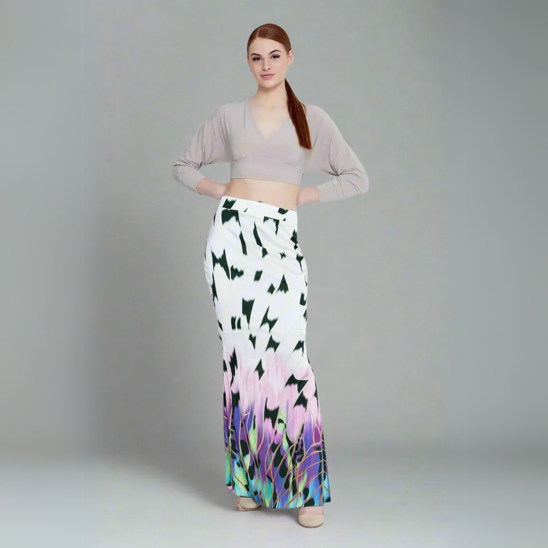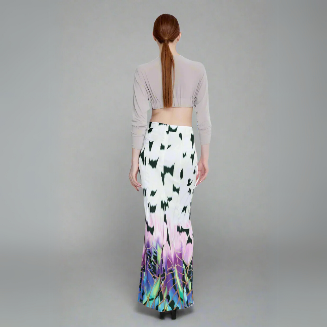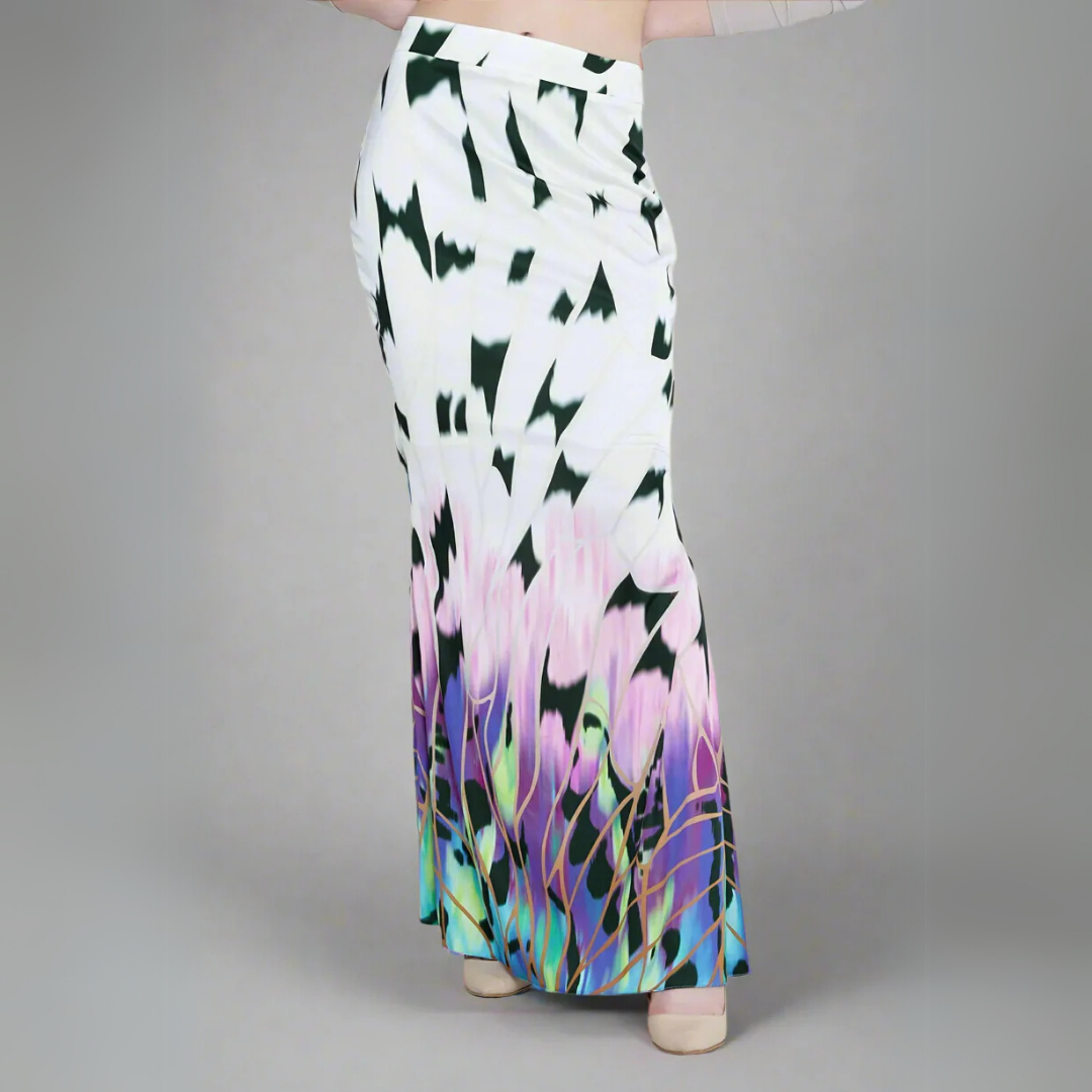 Introducing the Gradient Abstract Print Maxi Skirt, a striking piece designed to infuse your wardrobe with vibrant artistry. This full-length skirt features a flattering, sleek silhouette with a bold, eye-catching print. The design transitions from a monochromatic top section with an abstract, dark, almost leaf-like pattern against a white background, flowing into a captivating gradient of lavender, green, and blue hues at the hem. This skirt is an ideal choice for making a distinct fashion statement, perfect for both elevated daytime events and sophisticated evening occasions