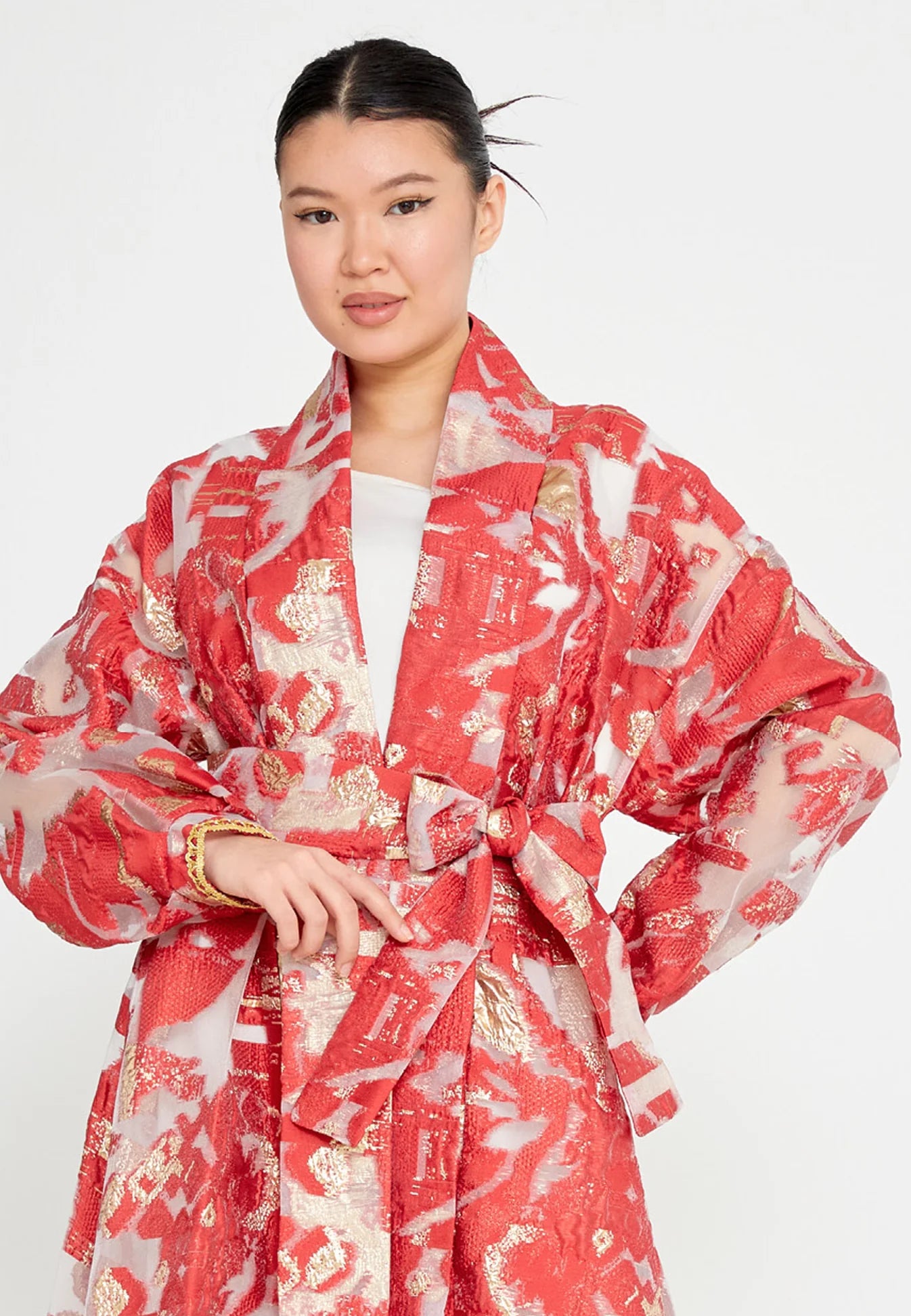 Introducing the Illuminated Tulle Wrap Abaya, a truly captivating piece designed to add ethereal elegance and distinctive style to your wardrobe. This regular-fit abaya is crafted from a luxurious tulle fabric, offering a sheer and lightweight drape. It features a mesmerizing all-over pattern in shades of vibrant Red, intricately interwoven with shimmering gold details that catch the light beautifully. The design includes wide, voluminous sleeves for a graceful silhouette and a coordinating self-tie belt to cinch the waist, allowing for adjustable styling. A delicate gold trim subtly accents the hem, adding a touch of refined luxury. This abaya is an exquisite choice for special occasions, festive gatherings, or for anyone seeking to make a radiant and elegant