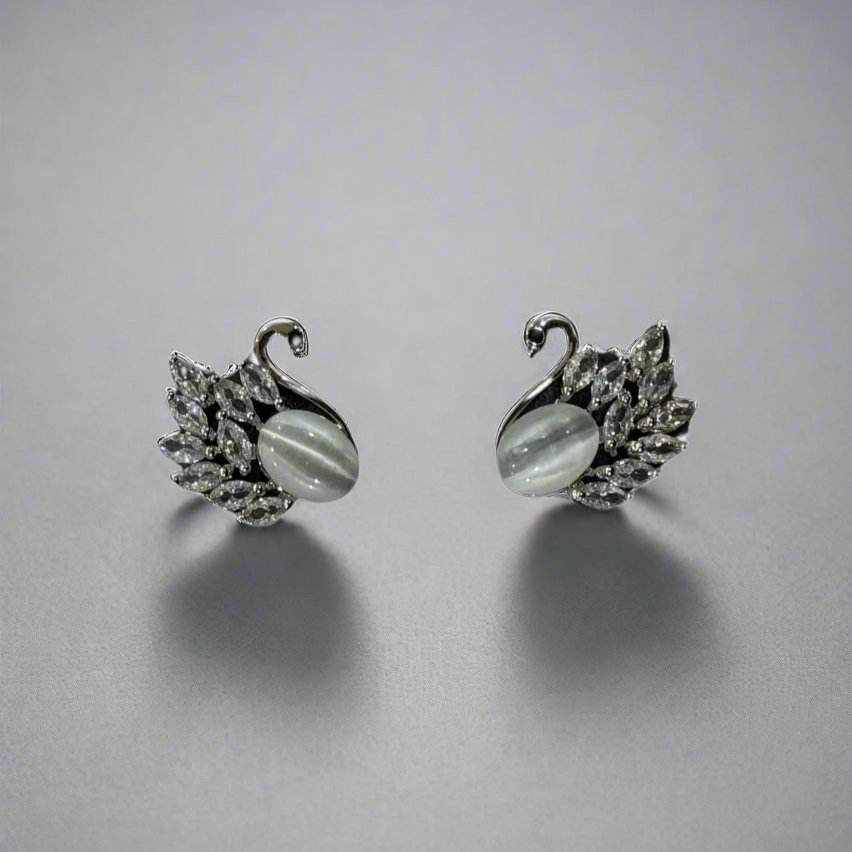 Discover the exquisite charm of our Opalescent Swan Stud Earrings, available in both radiant Gold-tone and elegant Silver-tone finishes. Each earring is meticulously crafted to depict a graceful swan, featuring a luminous oval opalescent cabochon that forms the body, beautifully complemented by a fanned arrangement of sparkling marquise-cut clear crystals that emulate feathered wings. These refined pieces capture classic elegance with a touch of whimsical sophistication, making them an ideal accessory for adding a distinguished glimmer to any ensemble.