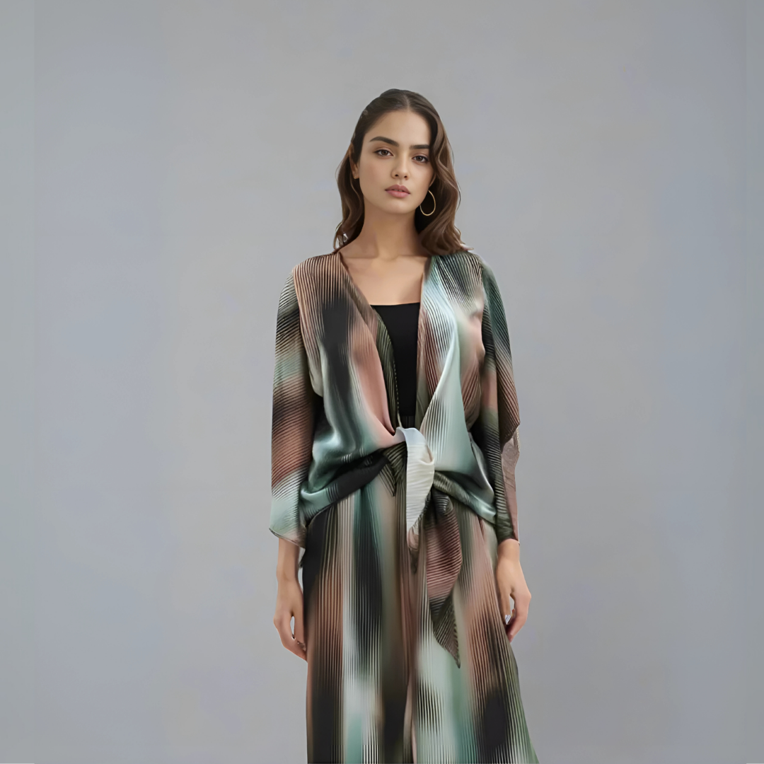 Introducing the Pleated Ombre Co-ord Set, an exquisitely fluid and contemporary ensemble designed for sophisticated ease. This two-piece set features a captivating abstract ombre print, transitioning seamlessly through shades of earthy terracotta, soft teal, and deep charcoal, all rendered with a delicate vertical pleated texture that adds dynamic movement and visual intrigue. The top, a relaxed kimono-style silhouette, is elegantly designed with a self-tie front, allowing for versatile styling. The coordinating wide-leg trousers cascade gracefully, ensuring fluid motion and a modern drape.