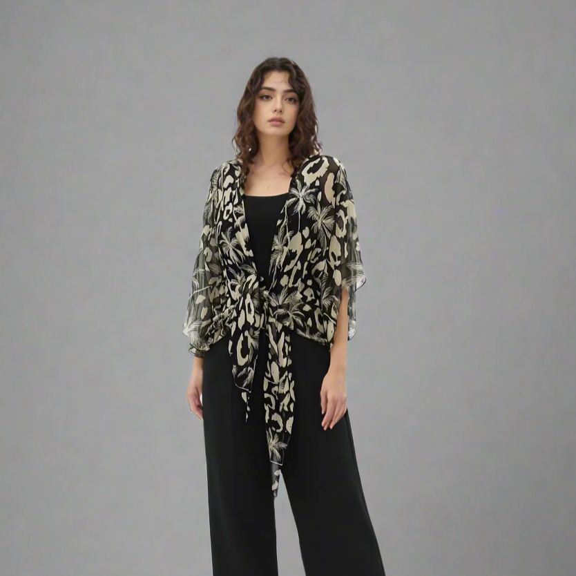 Introducing the Sheer Abstract Print Tie-Front Kimono, an artful and lightweight layering piece designed to add a touch of sophisticated flair to any ensemble. Crafted from a delicate, semi-sheer fabric, this piece features an engaging black and cream abstract print that evokes a blend of organic and animalistic motifs. The open-front design is complemented by a stylish self-tie closure at the waist, allowing for versatile styling options – wear it tied for definition or open for a relaxed drape. With its flowing silhouette and three-quarter length sleeves, this kimono is an ideal layering piece for evening wear, resort attire, or for adding an element of visual interest to a simple base.
