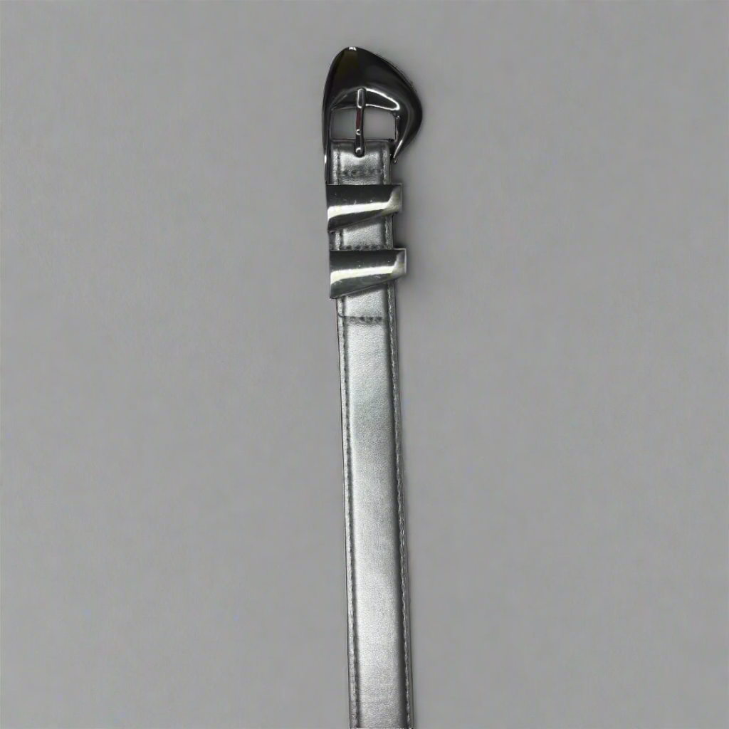 Introducing the Polished Silver-Tone Buckle Belt, a sophisticated accessory designed to add a sleek, metallic accent to your ensemble. This belt features a slender strap with a subtle sheen, offering a modern and versatile foundation. The focal point is a distinctive silver-tone buckle with a gently curved, almost sculptural form, complemented by a set of three angular keeper loops that add a contemporary edge. This belt seamlessly blends classic design with subtle modern detailing, making it an ideal choice for cinching dresses, pairing with tailored trousers, or enhancing any outfit with a touch of polished elegance.
