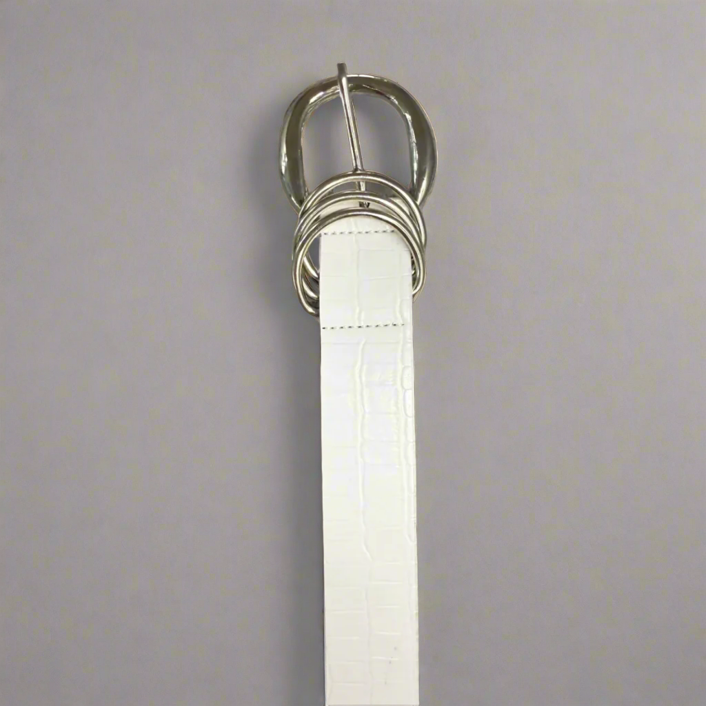 Introducing the Textured Statement Buckle Belt, a bold accessory designed to define your silhouette. This wide belt features a sophisticated textured finish, offering subtle visual depth. It is complemented by a prominent, oversized polished silver-tone buckle with distinctive concentric loops, creating a striking focal point. Available in crisp White and a vibrant Blue, this belt is an ideal choice for adding a contemporary and impactful element to both casual and more refined ensembles.