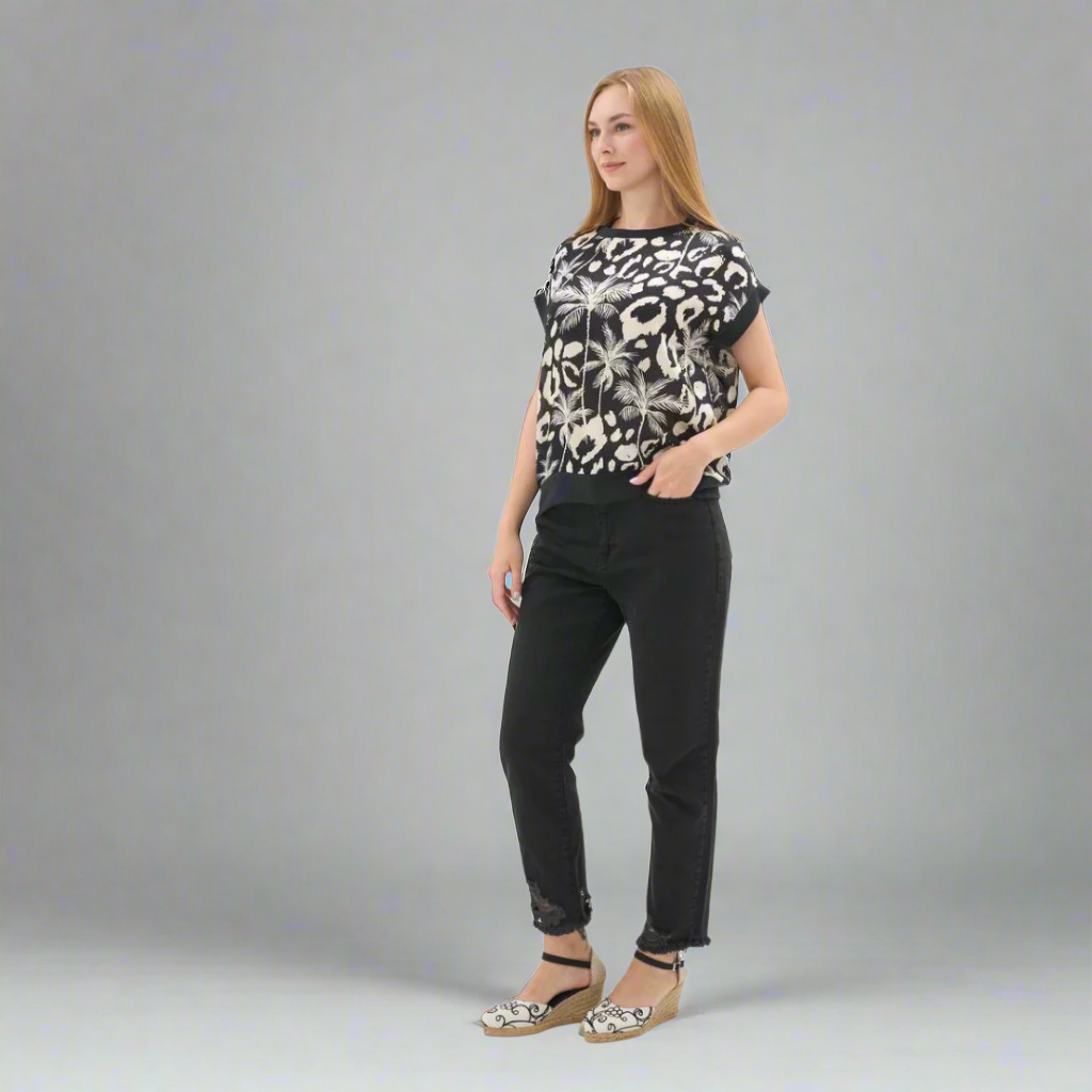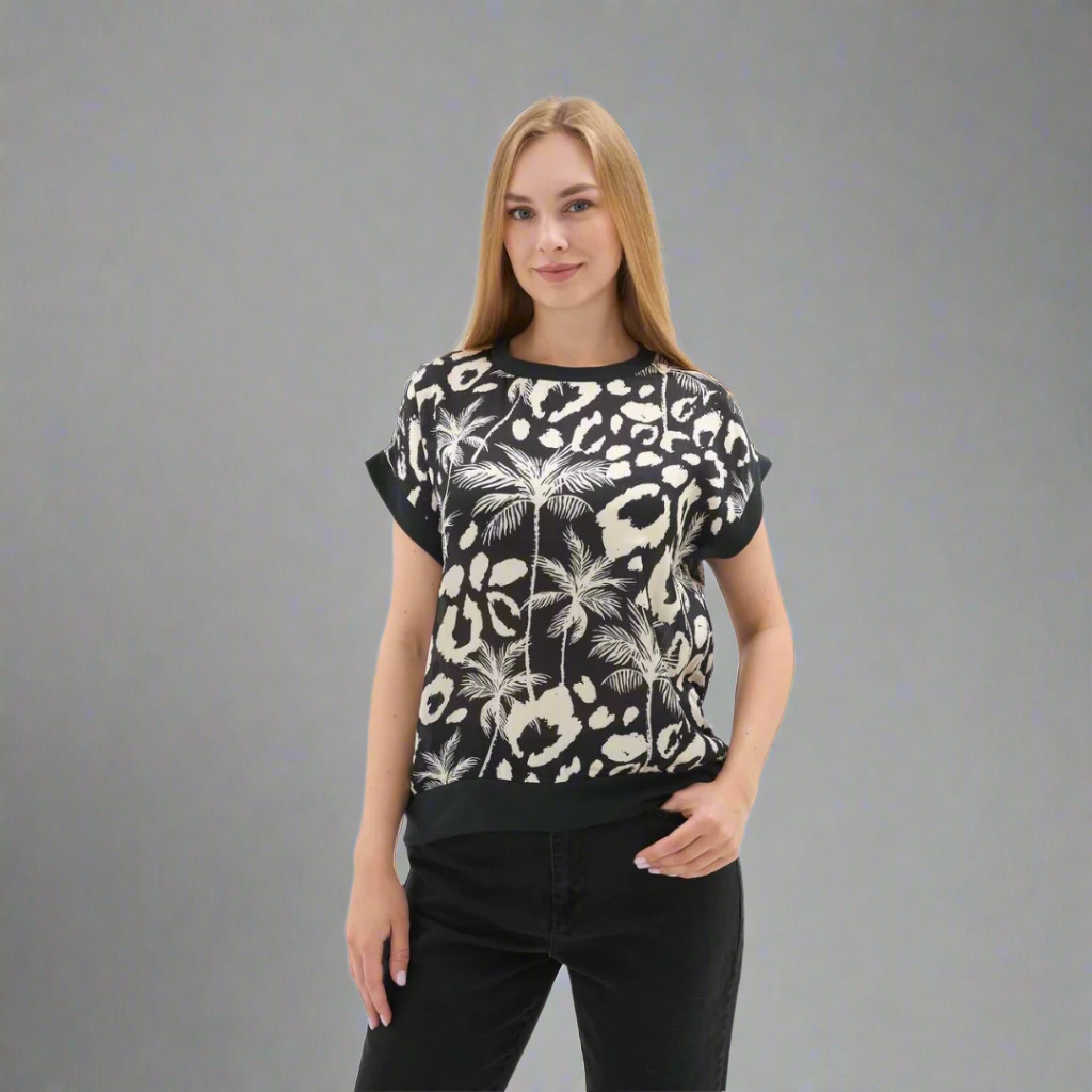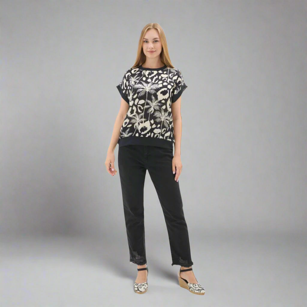 Introducing the Exotic Print Relaxed T-Shirt, a stylish and comfortable top designed to make a unique statement. This short-sleeved t-shirt features a relaxed silhouette with rolled cuffs, offering a casual yet refined look. The captivating print combines lush palm trees with abstract leopard spots in a striking black and off-white palette, creating a dynamic fusion of tropical and wild aesthetics. This versatile top is ideal for adding a touch of exotic flair to everyday wear or elevating a casual ensemble with its distinctive pattern.