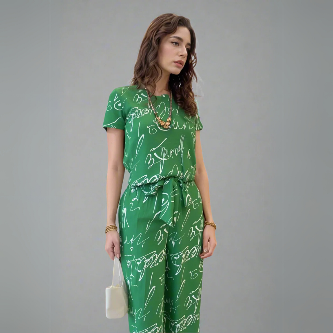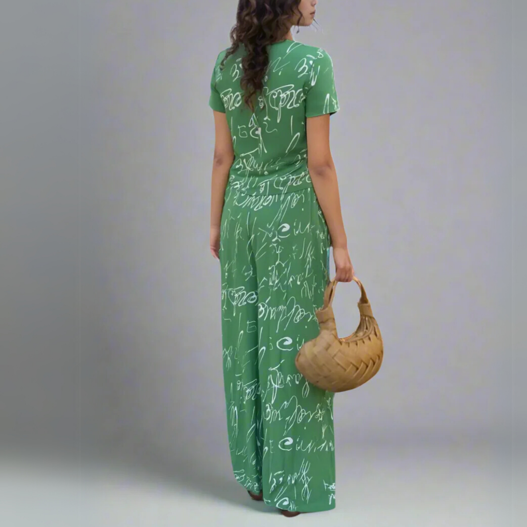 Introducing the Verdant Script Print Set, an effortlessly chic ensemble designed for contemporary comfort and distinctive style. This two-piece set features a vibrant emerald green base adorned with an elegant, free-flowing white script print, creating a unique and artistic visual. The top, a relaxed short-sleeved silhouette, offers ease of wear, while the coordinating trousers feature a comfortable elasticated waist with a self-tie belt, allowing for a customizable fit. The wide-leg cut of the trousers ensures graceful movement and a modern drape. Crafted from a lightweight fabric, this set is ideal for sophisticated casual wear, resort styling, or relaxed daytime events, embodying a refined yet relaxed aesthetic.