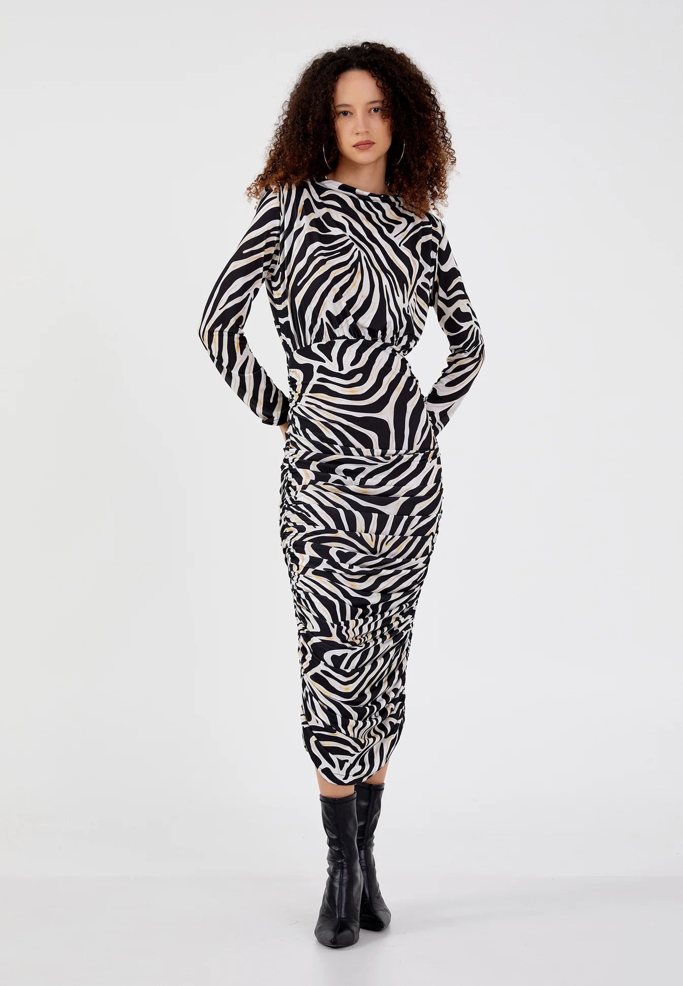 The Zebra Print Ruched Midi Dress