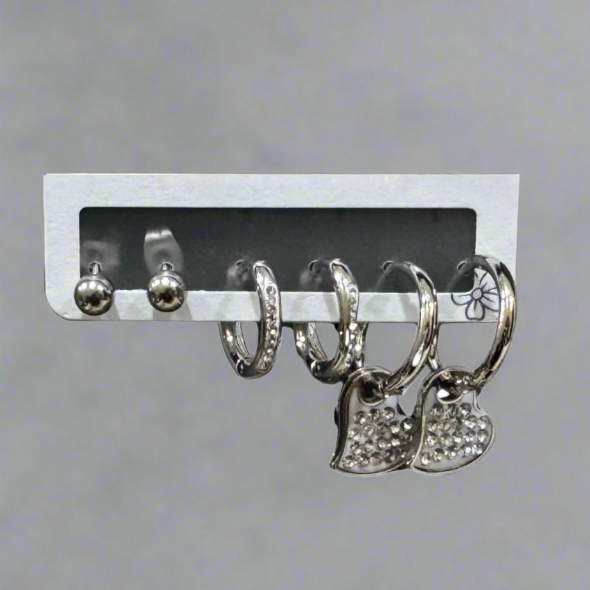 Introducing the Three-Piece Sterling Silver-Tone Earring Set, a versatile collection designed to offer multiple styling options. This curated set includes a classic pair of minimalist spherical stud earrings, providing understated elegance for everyday wear. Complementing these are a pair of sleek, small hoop earrings, perfect for adding a touch of contemporary chic. The set is completed with a pair of delicate drop earrings featuring pave-set heart charms suspended from slender hoops, lending a touch of romantic sparkle. Crafted in a polished sterling silver-tone finish, this set provides a cohesive yet adaptable range of adornments for various occasions.