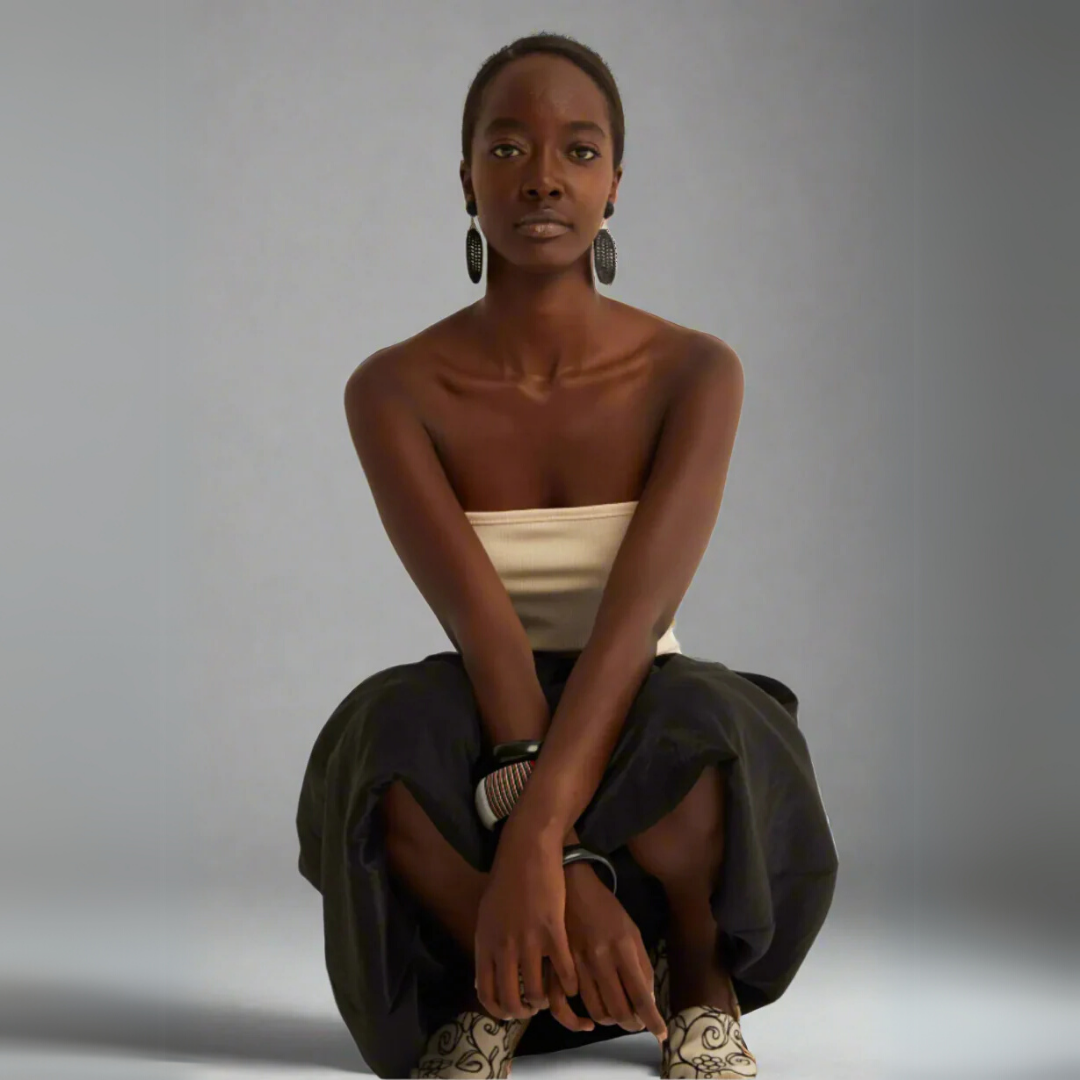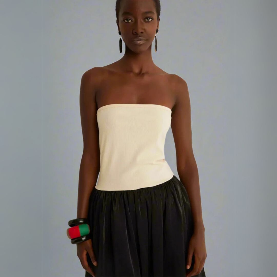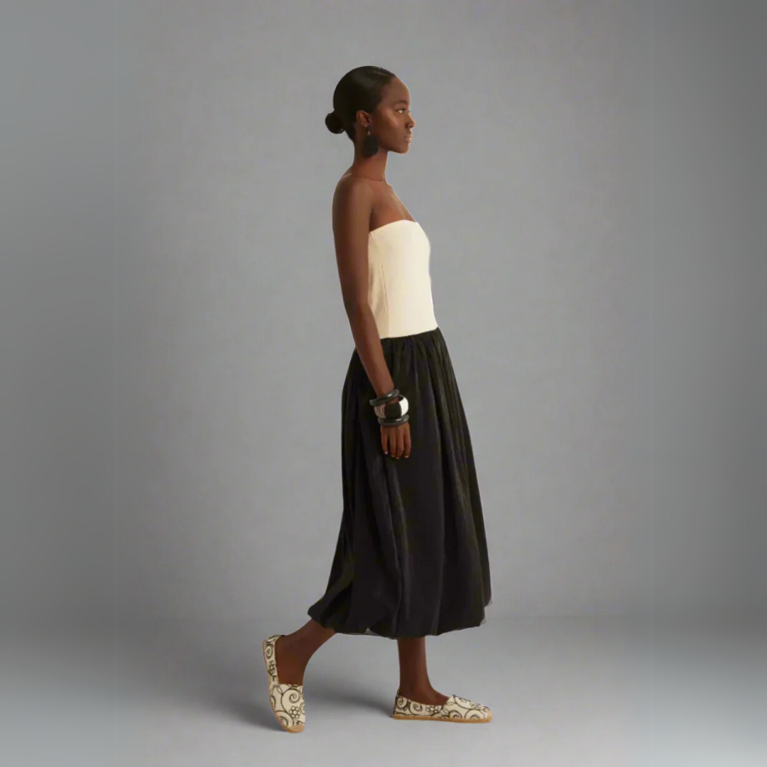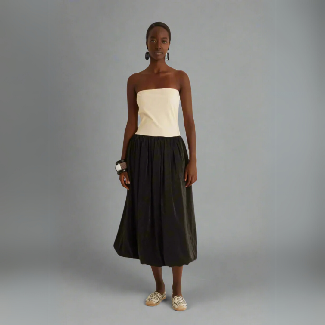 This sophisticated two-tone dress features a strapless ribbed upper in beige and a flowing black balloon skirt. Crafted from a premium blend of polyester, viscose, and elastane for the upper portion, it offers exceptional stretch and comfort, while the lightweight polyamide-polyester woven skirt creates elegant movement. The elasticated waist ensures a flattering fit for all body types. Made with eco-friendly materials, this versatile piece transitions effortlessly from day to evening occasions while maintaining its structural integrity through machine washing.