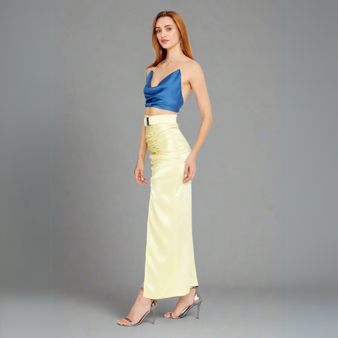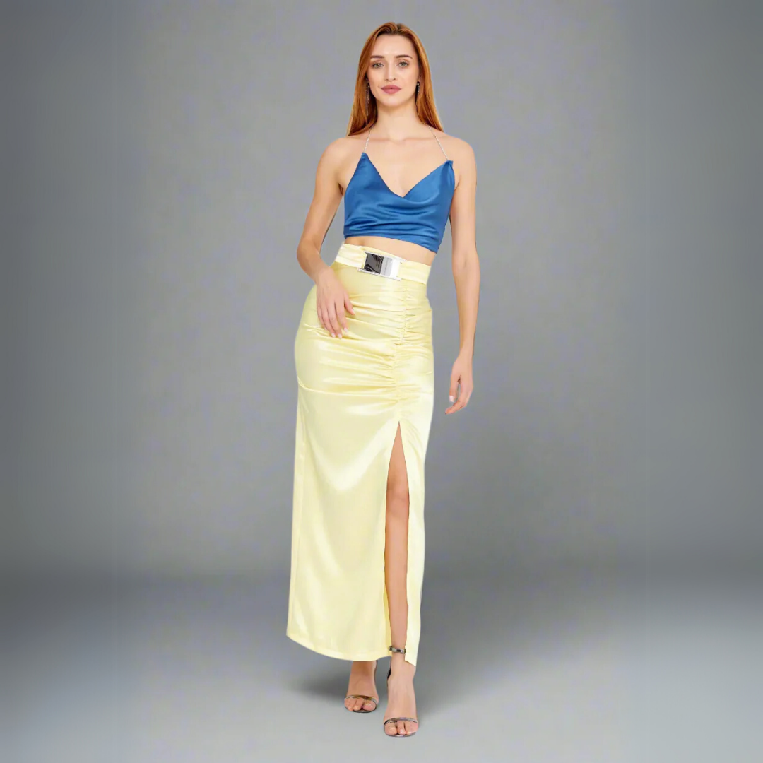 Introducing the Ruched High-Slit Satin-Effect Maxi Skirt, a captivating piece designed for both elegance and alluring movement. This skirt is crafted from a luxurious, lustrous polyester fabric that drapes beautifully to a maxi length, offering a rich satin-like appearance. It features artful ruching at the hip, creating a flattering texture and enhancing the silhouette. A sophisticated high-slit adds a touch of modern allure, ensuring graceful flow with every step. Available in a delicate Saffron Yellow and an enchanting Lavender, this skirt is an ideal choice for elevated evening wear, special occasions, or a refined statement.